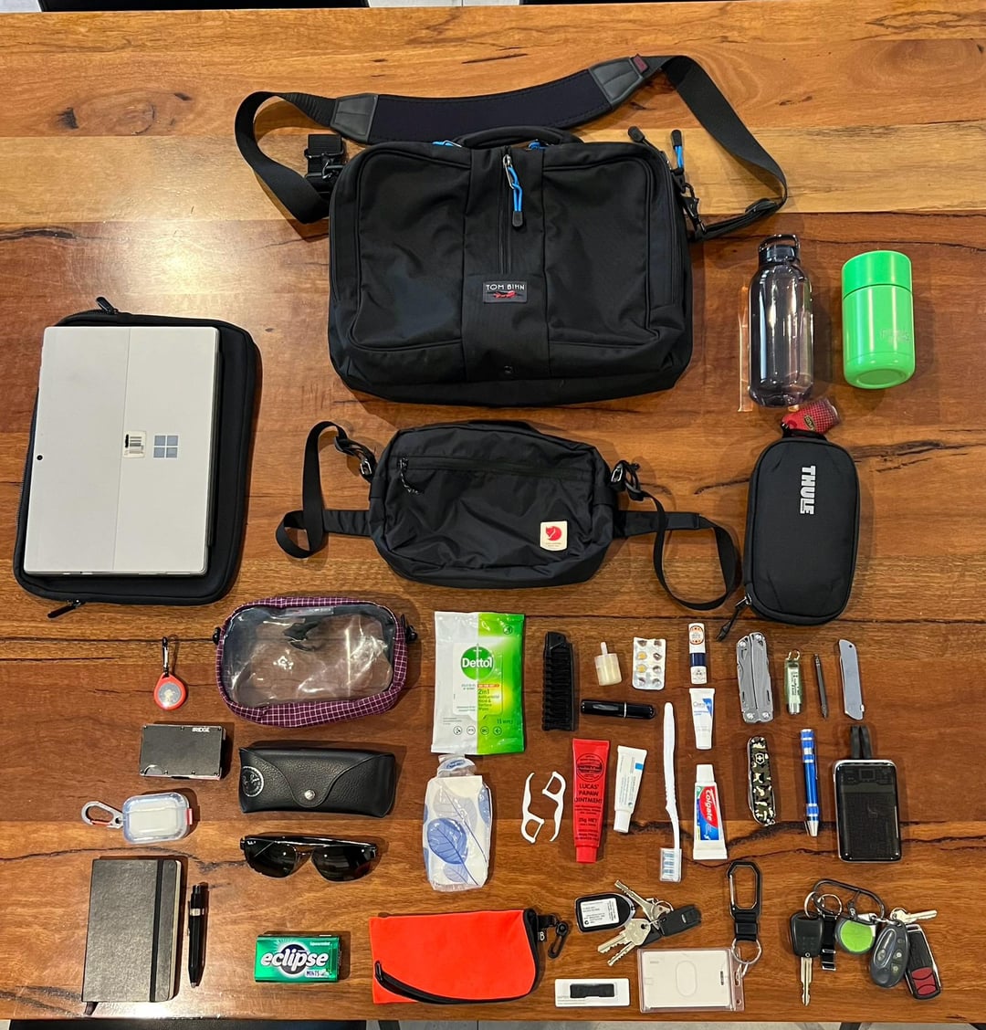 I’ve been honing this EDC for a couple of years, trying to balance reasonable weight (I’m a reasonably big guy so I don’t need it to be featherweight, but also I don’t want it to weigh more than a few kg!), practicality, and also hard-wearing / longevity as I tend to throw my bag around a fair bit, such as in and out of the car, and it also gets banged around at the various places I’m working from.