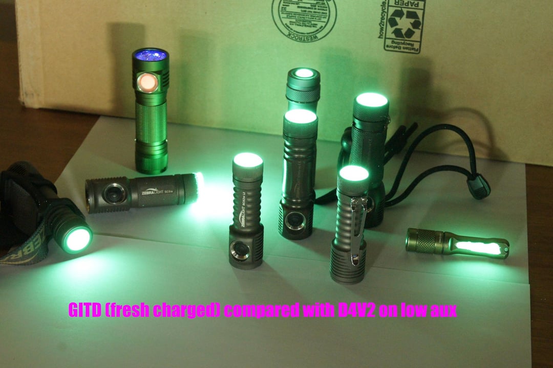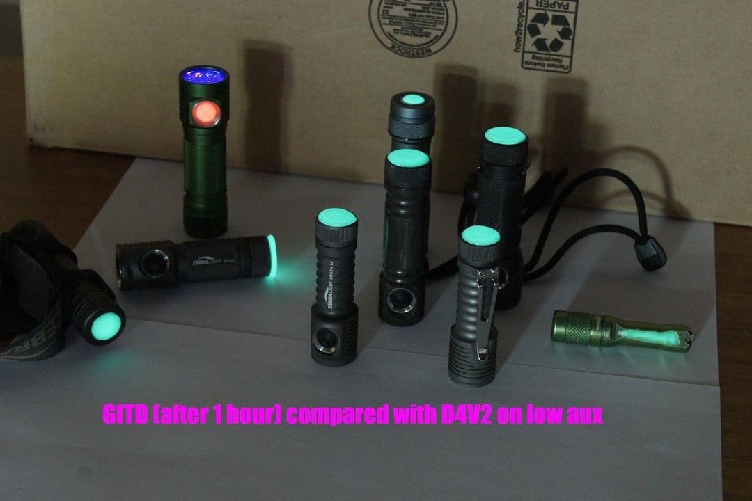 After 1 hour they have dimmed a lot, but they’re very easily seen in a dark room. The D4V2 on low aux is there for comparison and the GITD still outshines it.