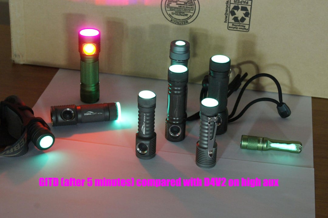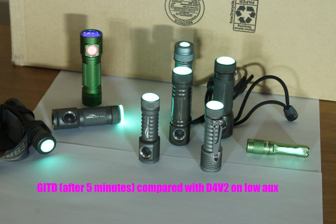 5 minutes shows the GITD lights are still almost as bright as the D4V2 switch on high. This is about what you can expect if you don’t “charge” them with a bright light.