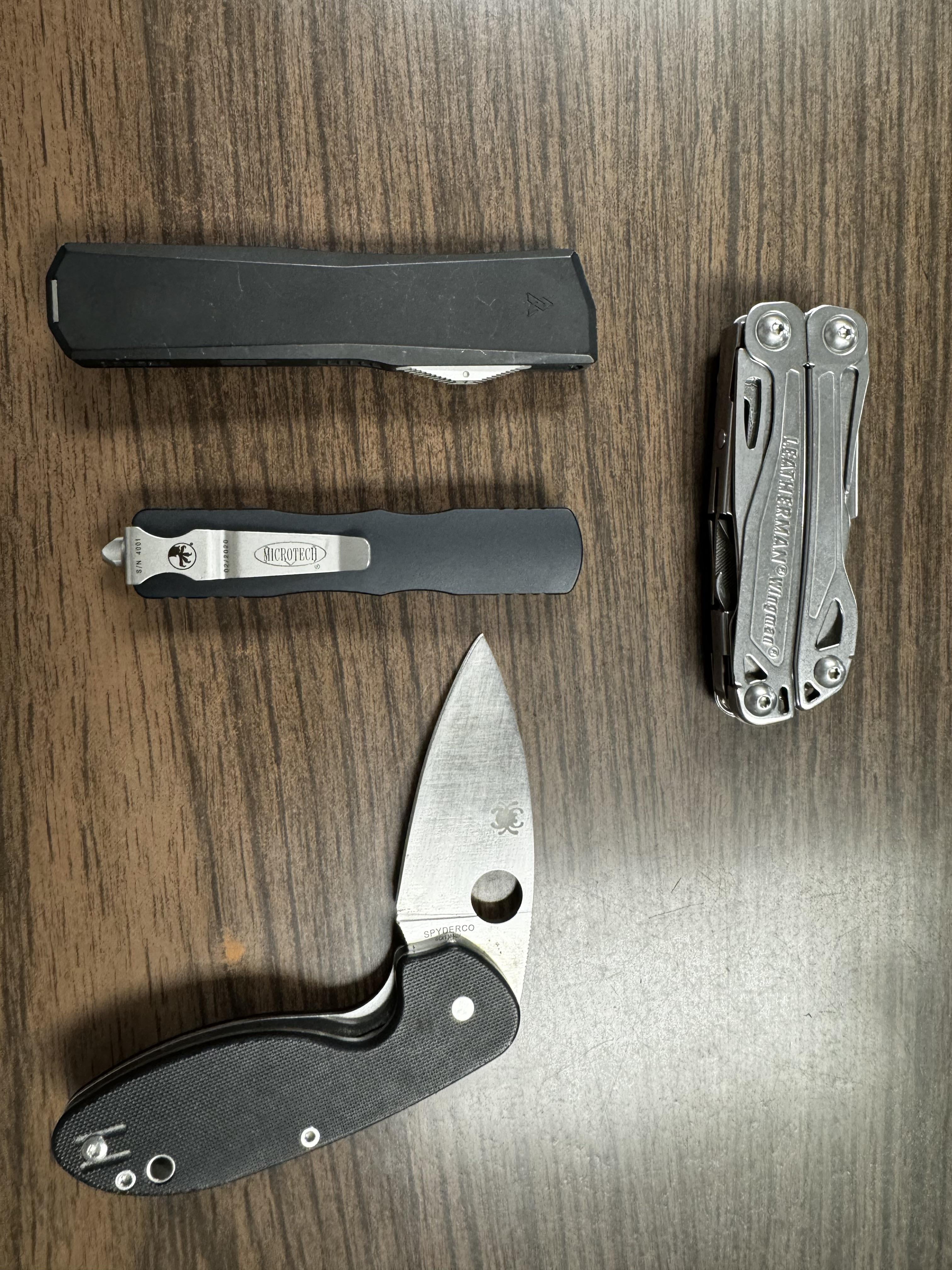 Capitalizethesegains 1 year ago Axial OTF a couple gens old but, my first OTFmicrotech Dirac my newest pick upOld spyderco from Amazon that I like to beat onLeather man wingman that gets the most mileage