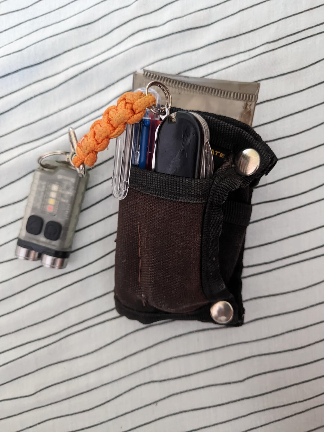 This little pouch either goes inside my sling or backpack, almost never inside s pocket (during summer at least), when I don’t want to carry the full thing usually I just take the sak and the light