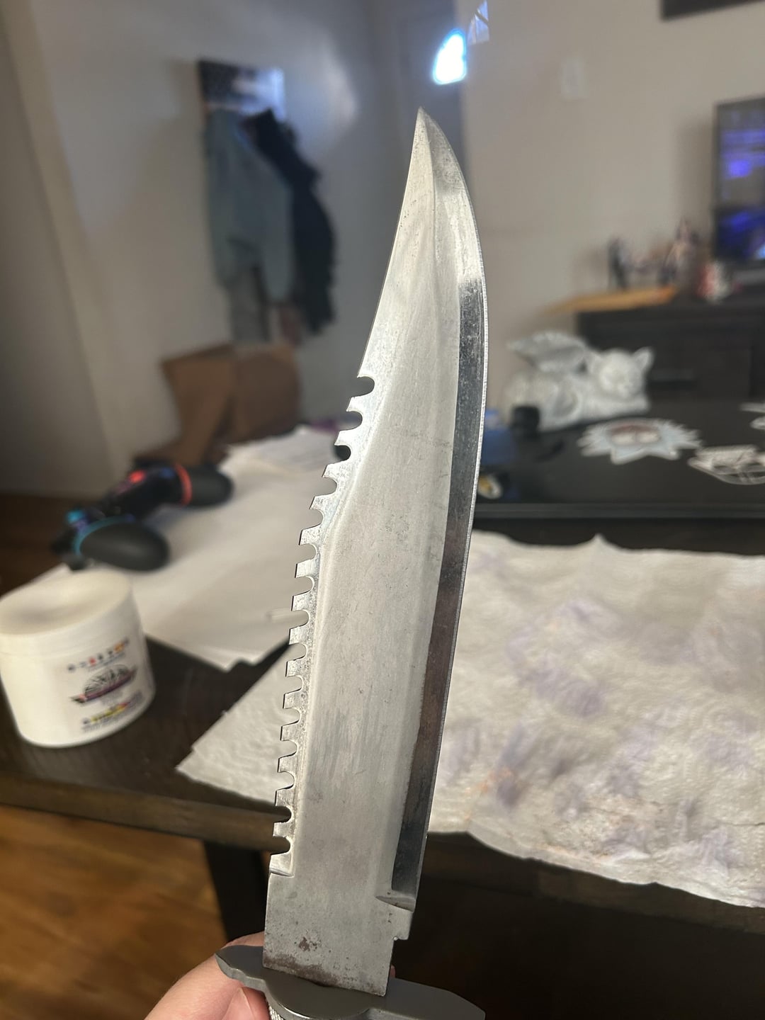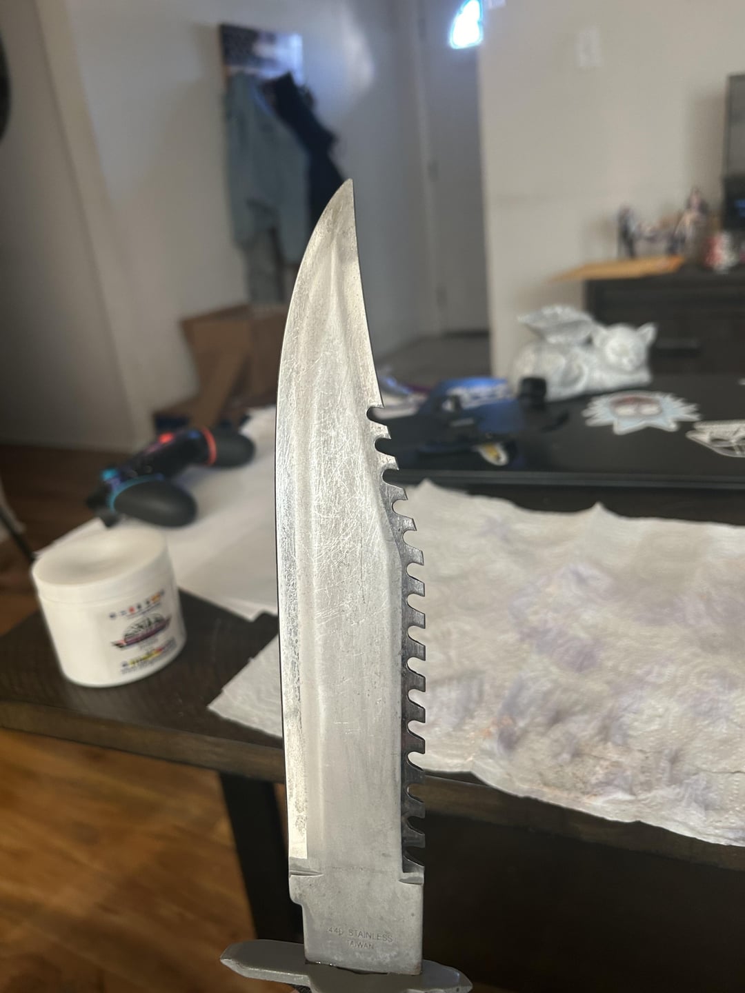 So, I have this old knife. That I think is a Bowie knife or at least some type of survival knife. It has languished away for years in a garage at an old trailer home that my family bought from some old dude when I was a kid. The guy had some stuff left in the home that my family would return years later, but the majority of it he didn’t care for.