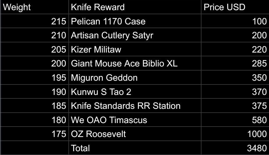 I’m looking to lose some weight with diet and exercise. As a little extra incentive I’ve created a list of knives I will allow myself to buy when I reach my targets and only when I reach my targets. I’m starting with an 8-slot Pelican knife case that I plan on filling as I progress. Currently the most expensive knife I own is about $200 so these rewards will be a real treat to myself. Anything you’d change from my list? Anyone wanna join?