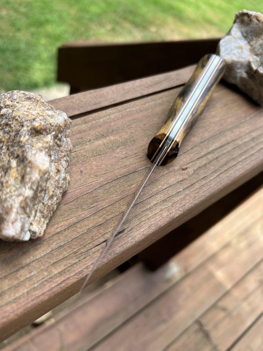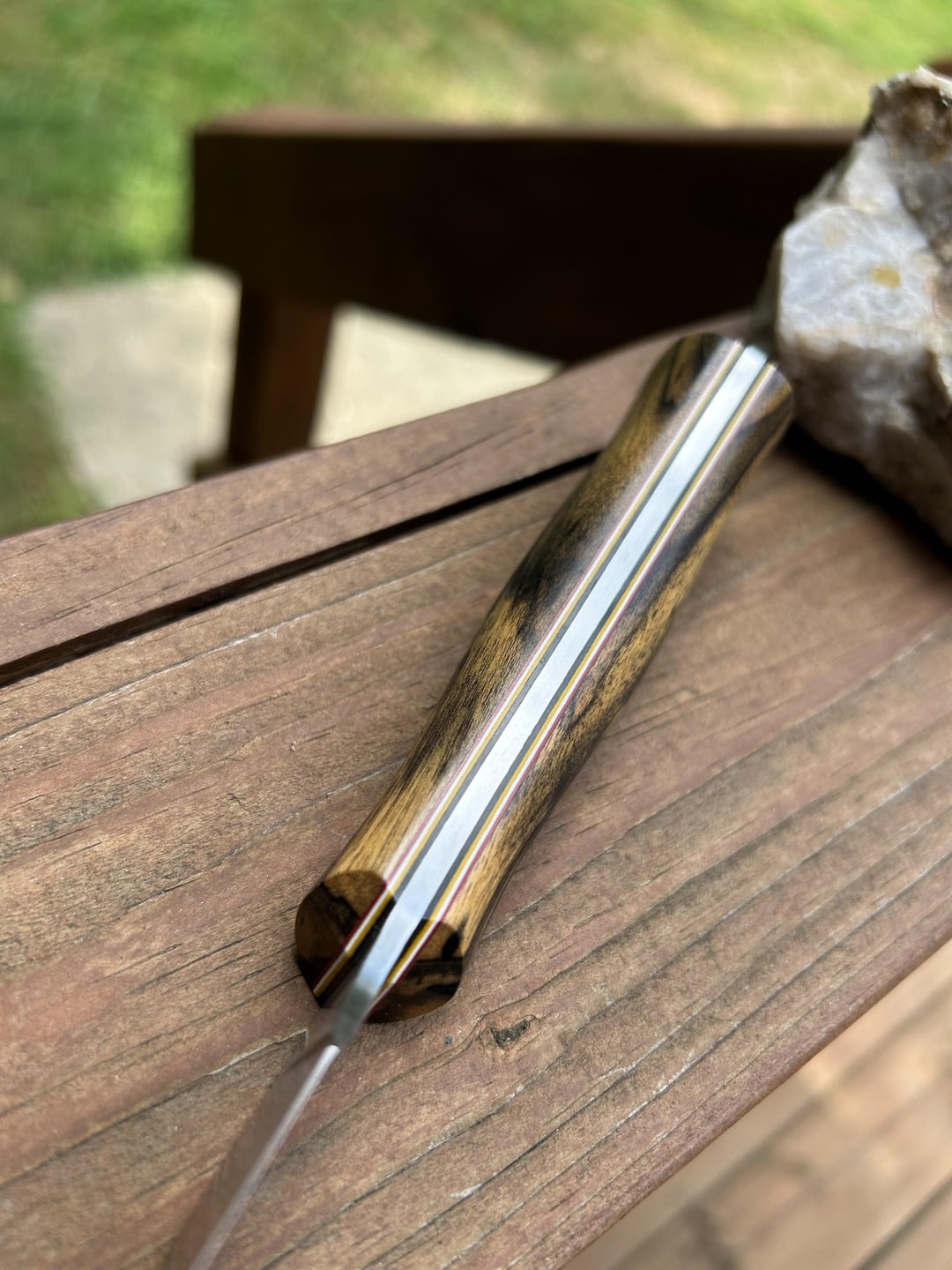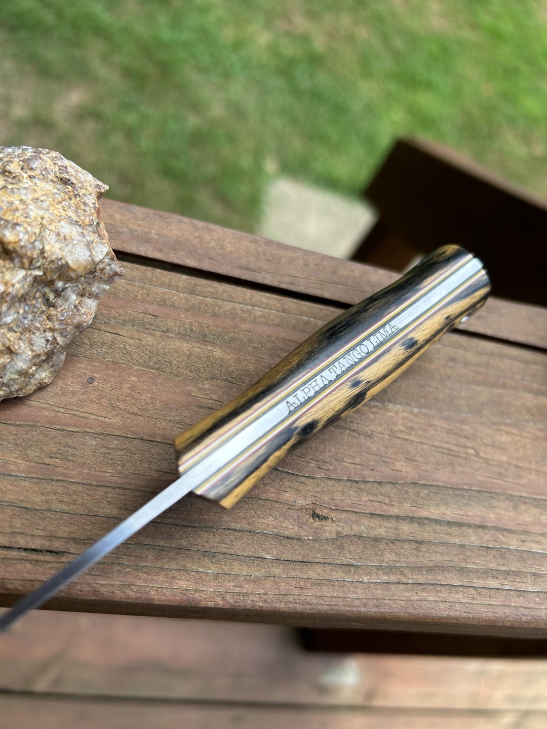 My Hollywood model Bird & Trout. Nitro-V hand sanded to 220 grit. Zero ground. Black and White Ebony scales triple liners with stainless steel pins and stainless steel lanyard tube. Thank you for looking!
