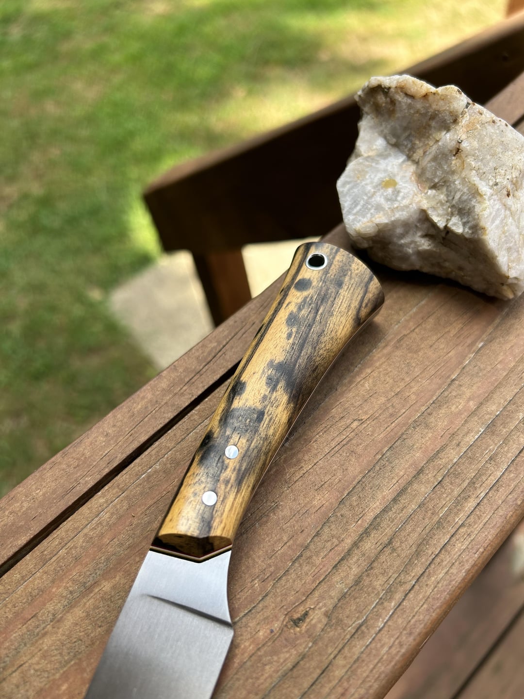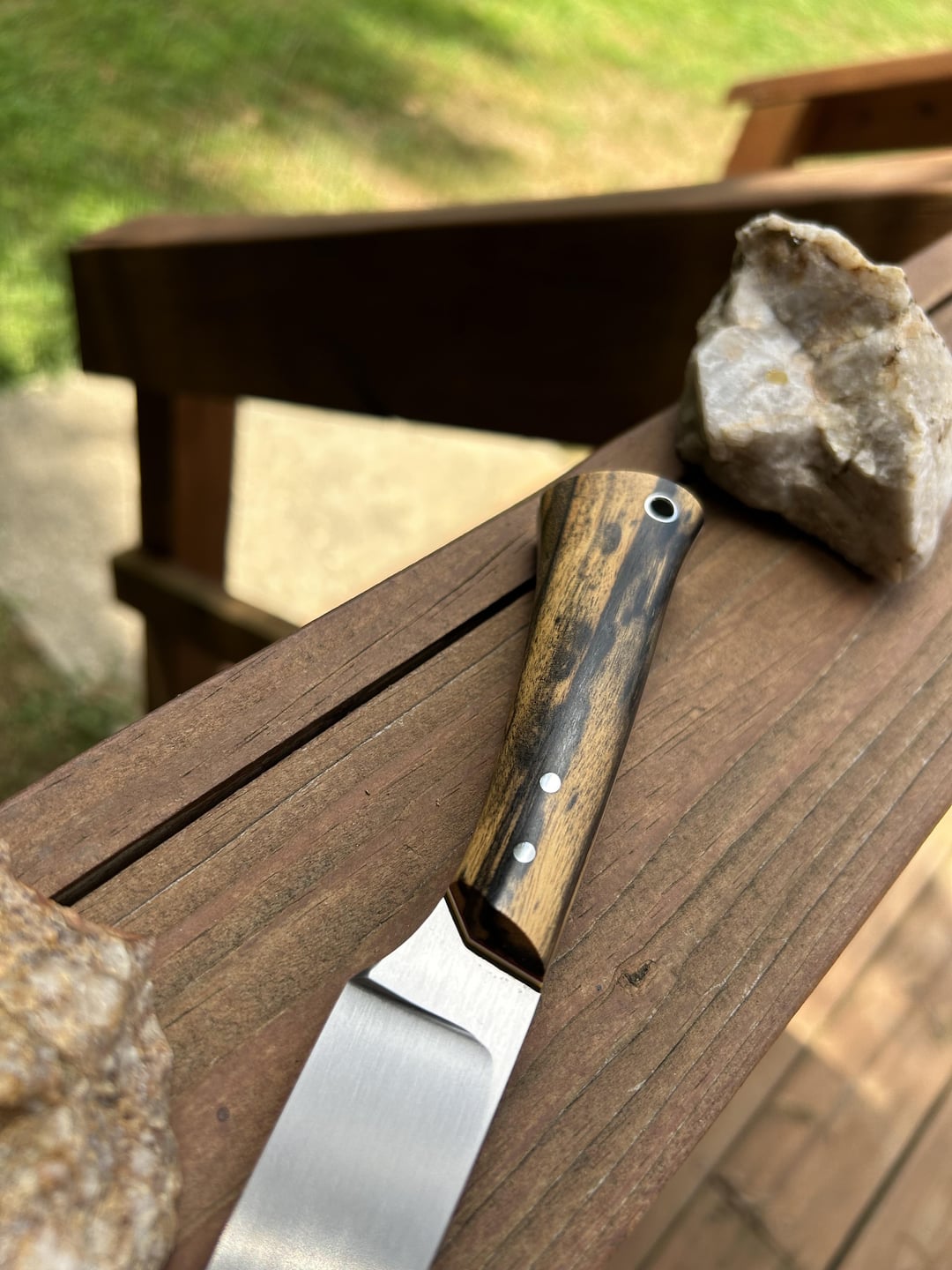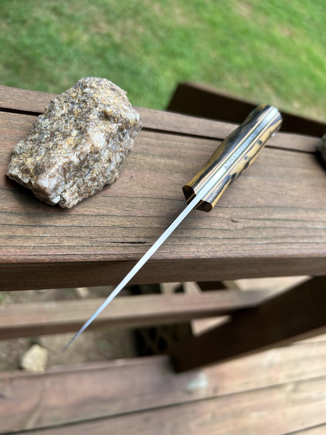 My Hollywood model Bird & Trout. Nitro-V hand sanded to 220 grit. Zero ground. Black and White Ebony scales triple liners with stainless steel pins and stainless steel lanyard tube. Thank you for looking!