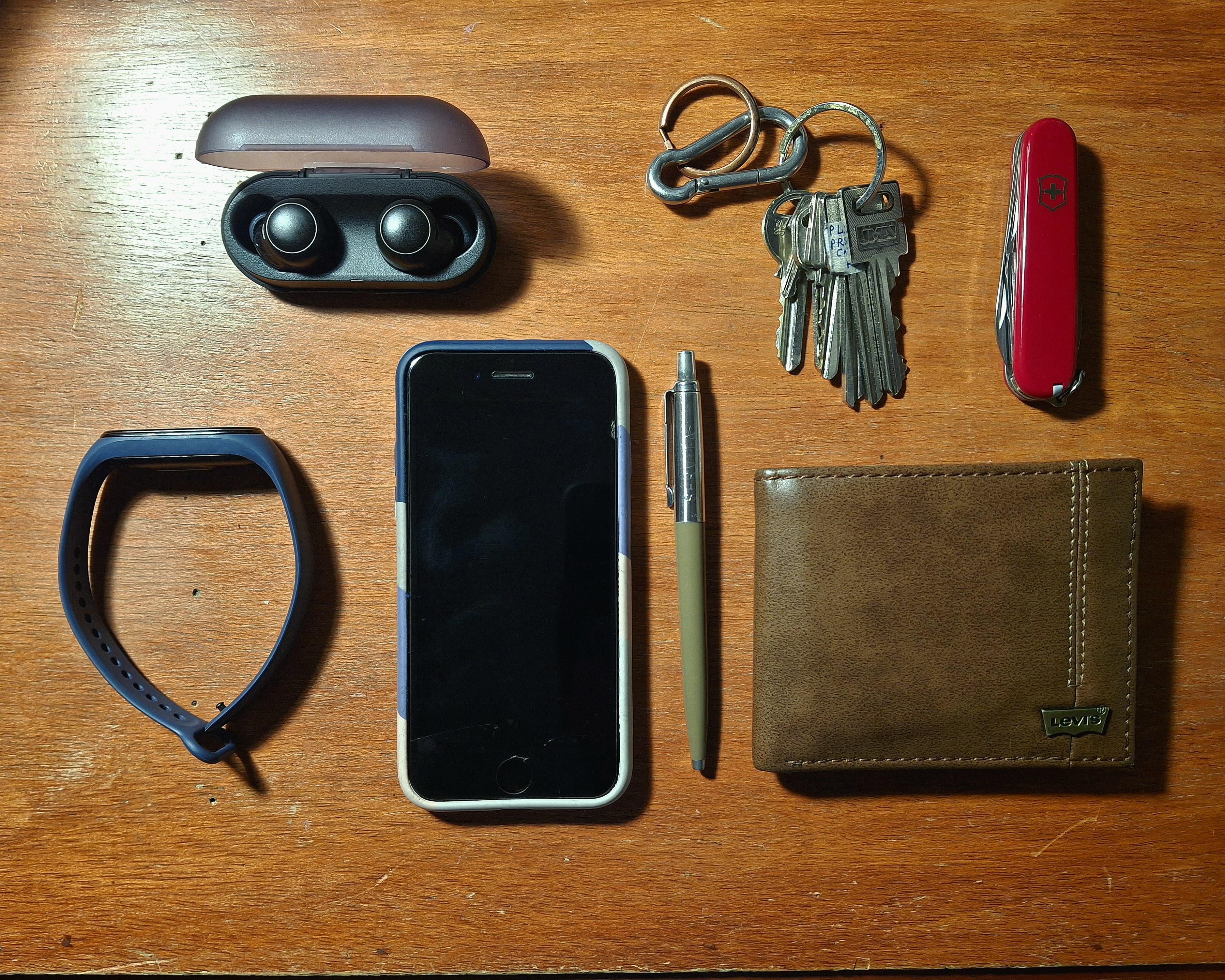 – Sony WF-C500 earbuds – Xiaomi Mi Band 5 – Parker blue pen – Keys – Victorinox Tinker knife – A Levi’s wallet