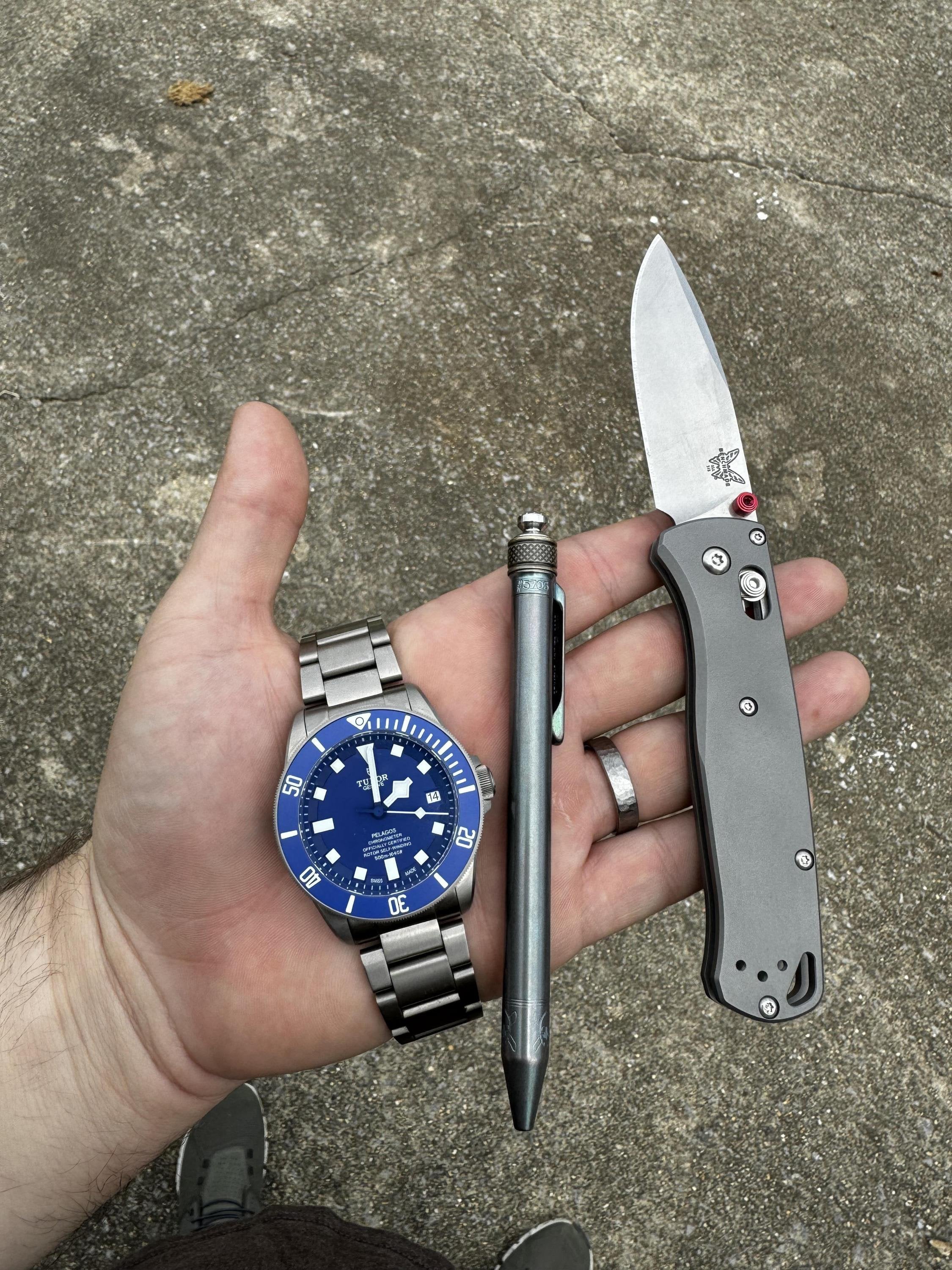 Tudor Pelagos, Grimsmo Saga, Benchmade custom Bugout (can’t walk away from 60% off), and then a titanium ring. Wasn’t really trying to rock the Ti today, but it just worked out.
