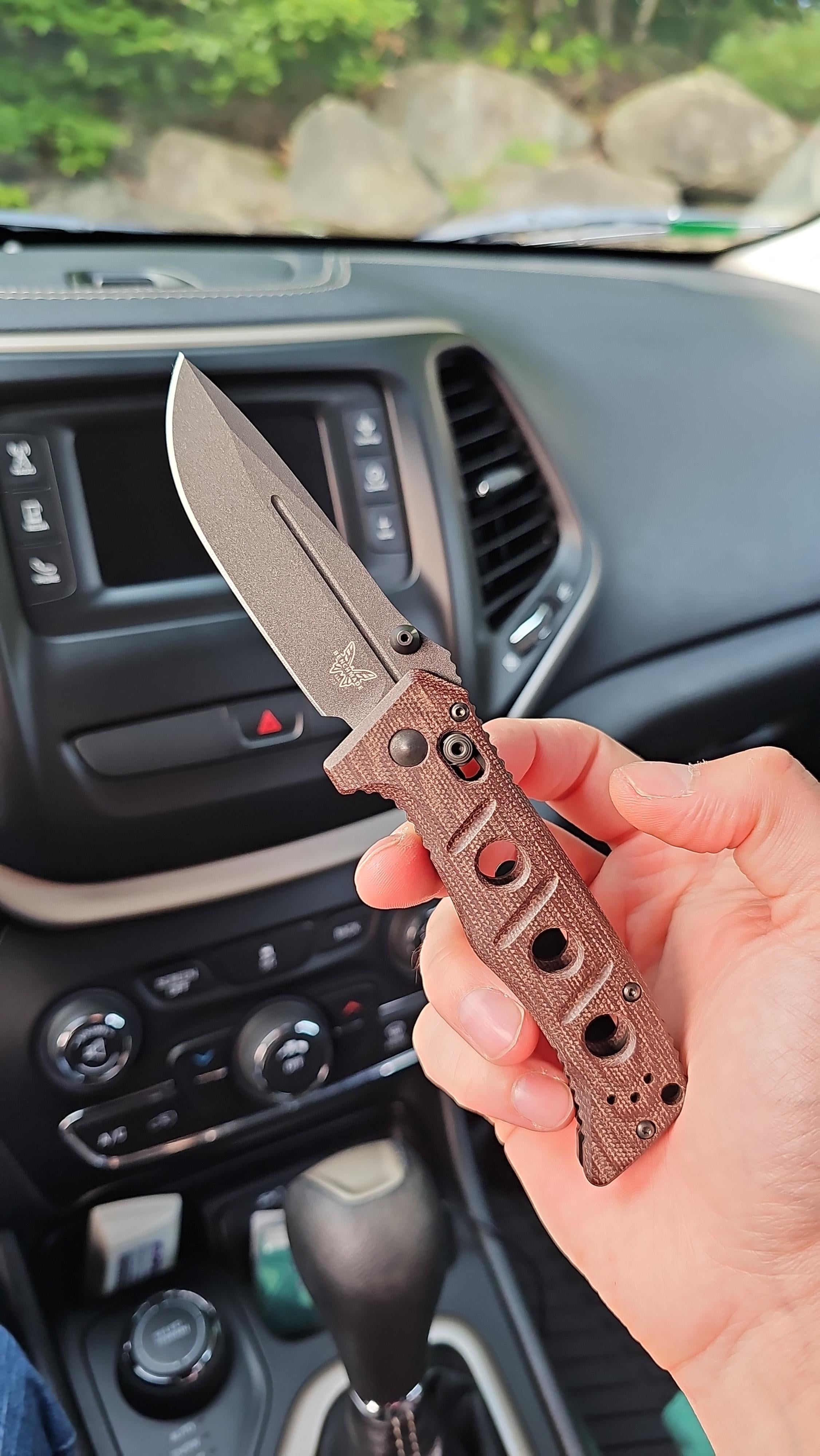 NKD – Benchmade Mini Adamas in Cruwear & burgundy micarta. Love the knife, wanted one for awhile but this particular one has typical Benchmade QC issues. A fair amount of side to side blade play and the pivot is adjusted as tight as it will get. Will have to take it apart, clean it and polish the washers. Hopefully that will fix it as I do really like the knife.
