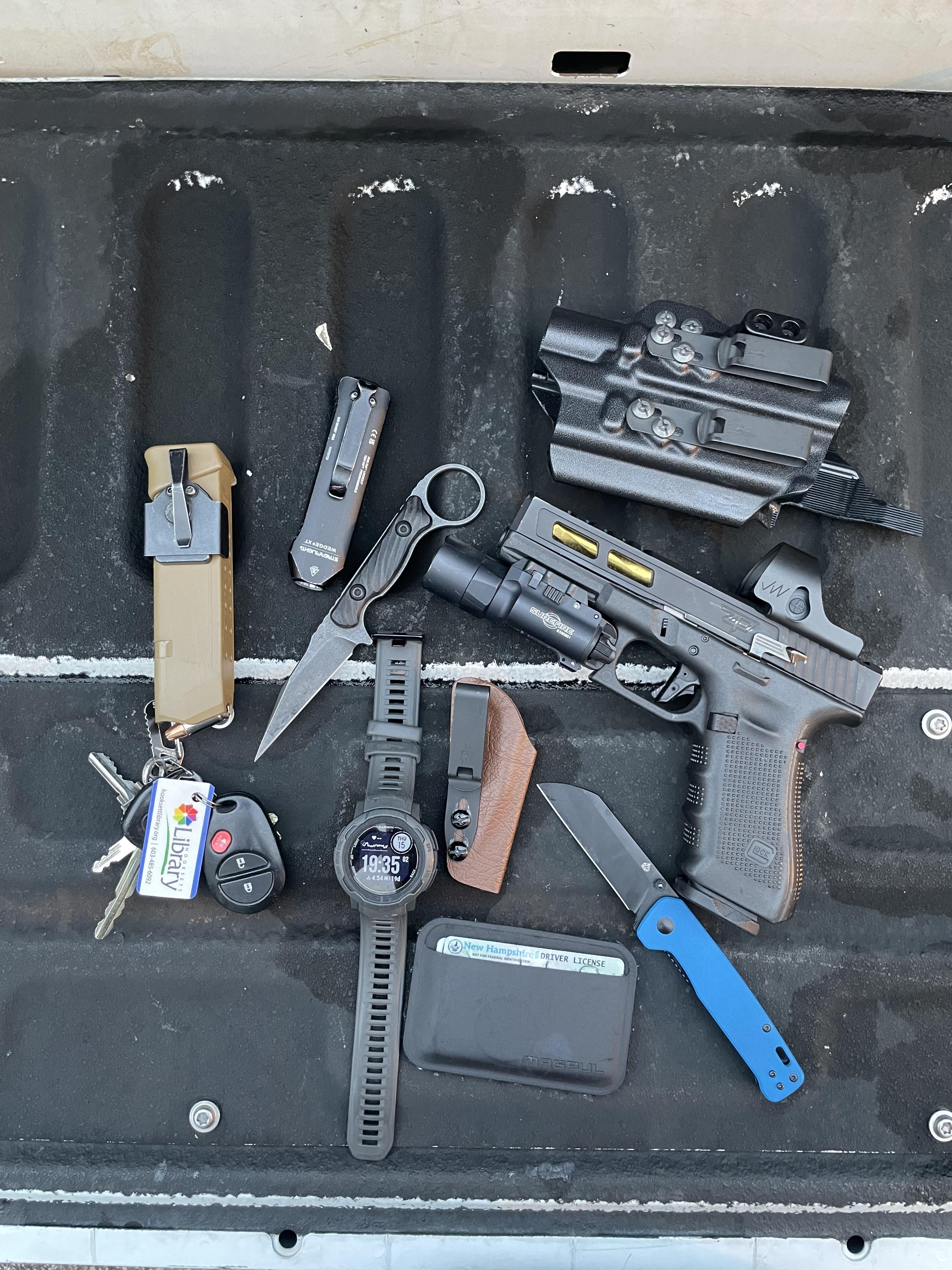 Neomag w/spare mag; streamlight wedge xt; Jank shank; instinct 2; QSP penguin; magpul wallet; gen 4 17; tenicor holster