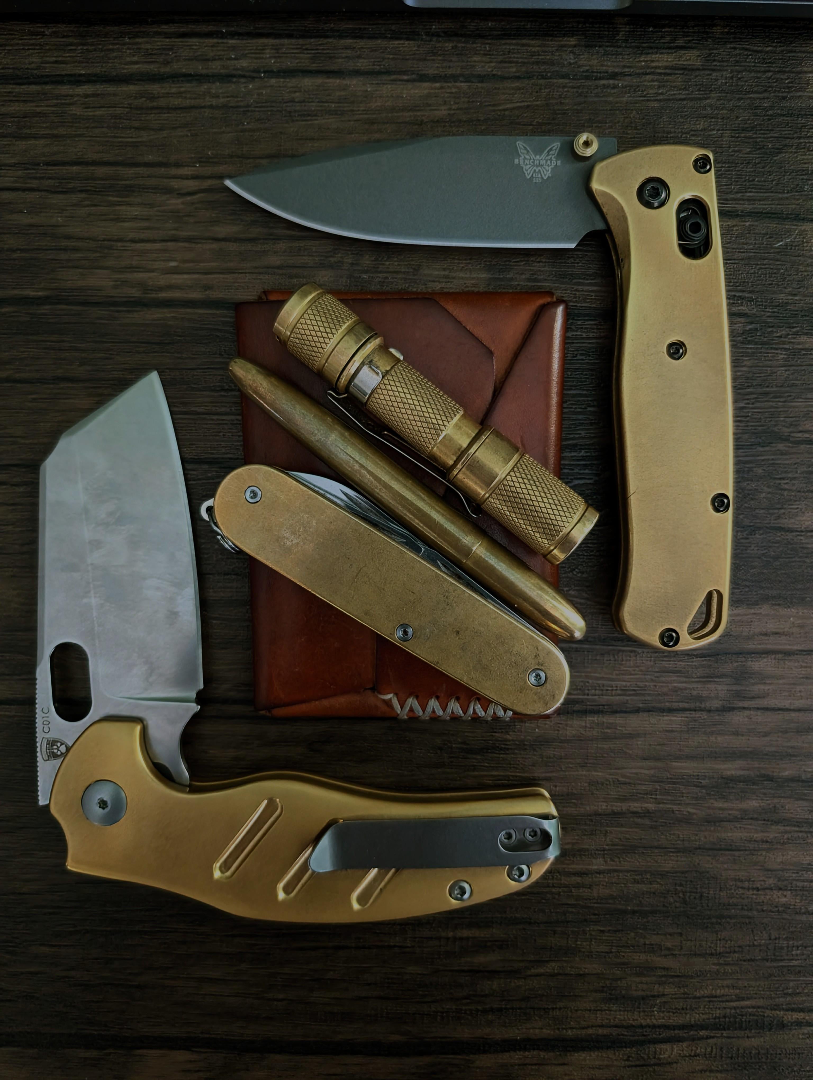 Open sea leather wallet, brass Fischer space pen, brass drop AAA flashlight, brass sack cadet, brass kizer sheepdog, brass Benchmade bugout