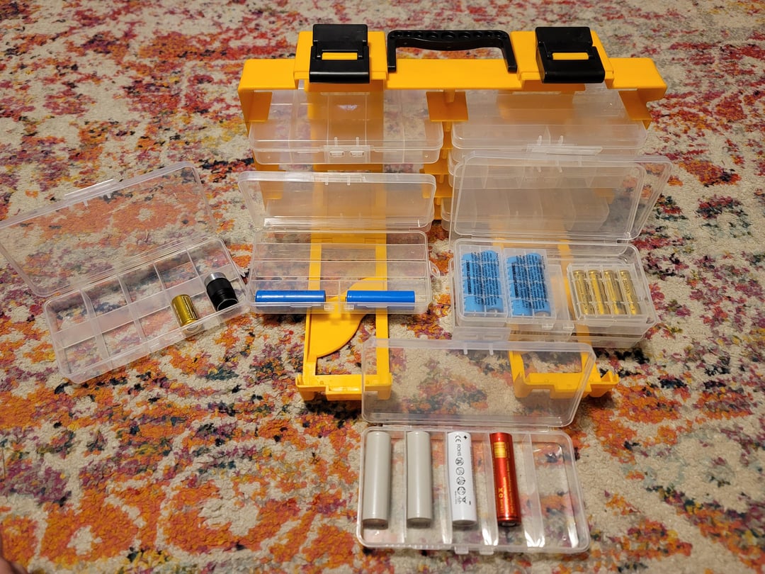 I hit up my local Harbor Freight this past weekend and found a pretty decent battery/accessory storage box for $13 U.S. I do wish a couple of the boxes had an extra divider or 2 but otherwise it almost seems made for the li-ion batteries.