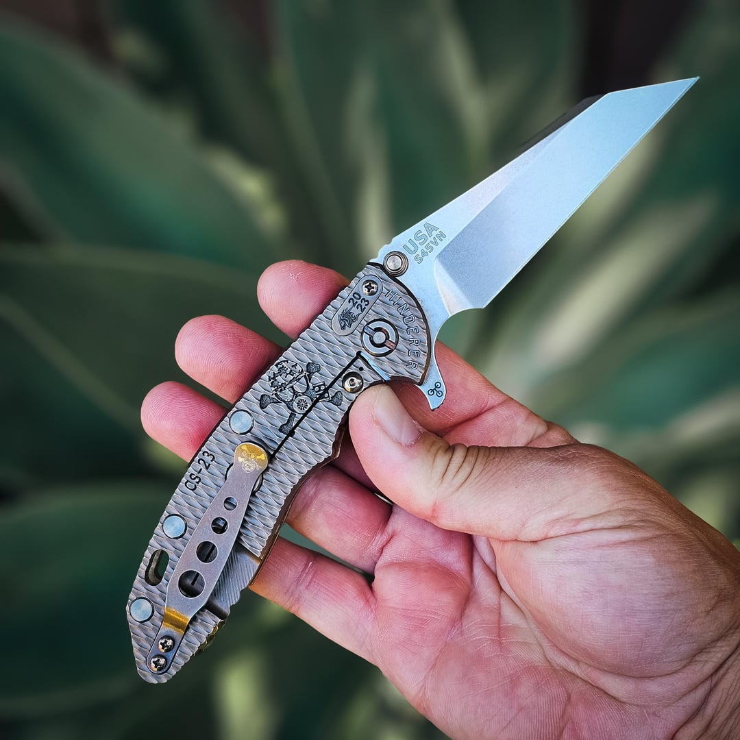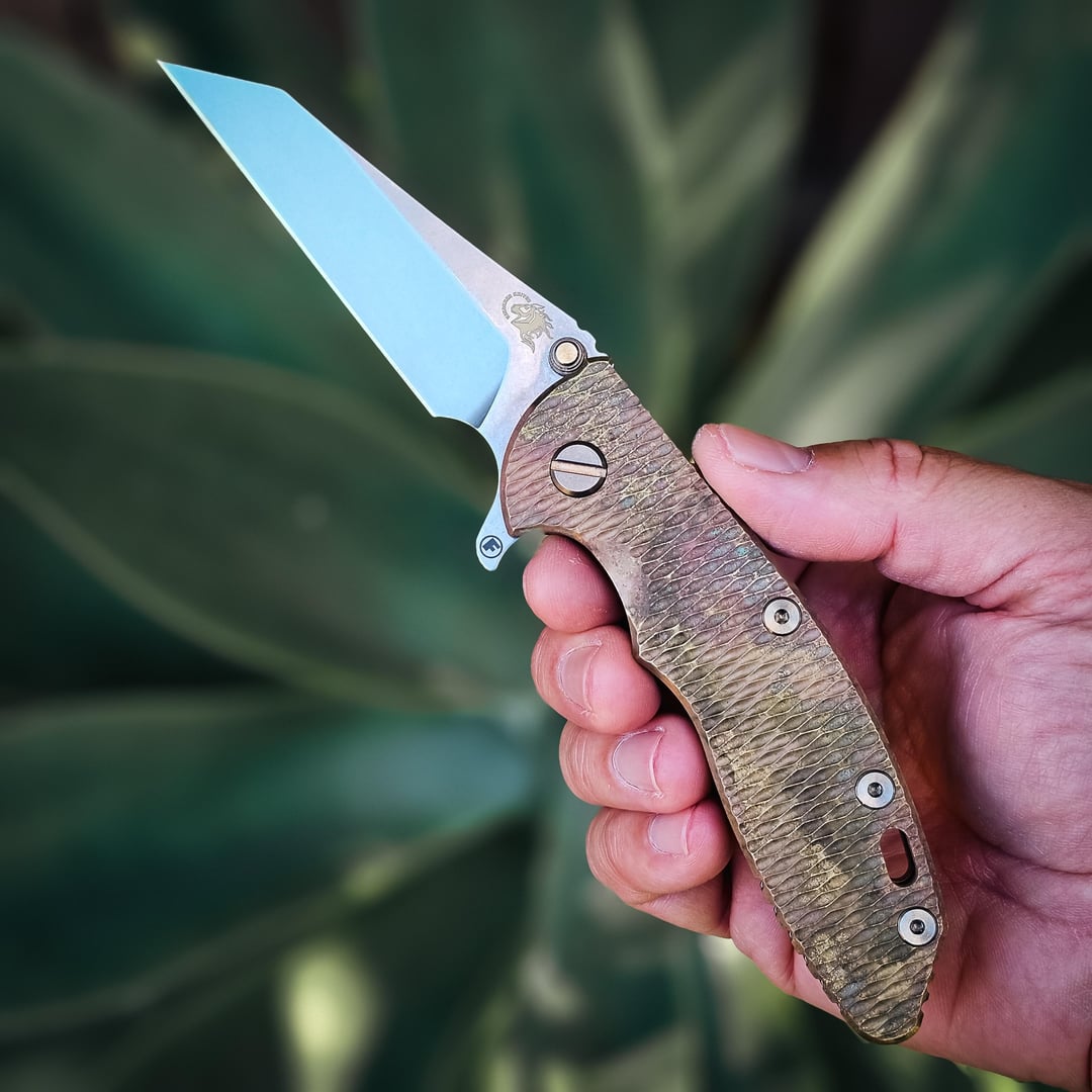 🔪 @hinderer_knives XM-18 3.5″ *Containment Series* S45VN Fatty Wharncliffe with stonewashed bronze textured lockside and hardware with a custom patina brass scale