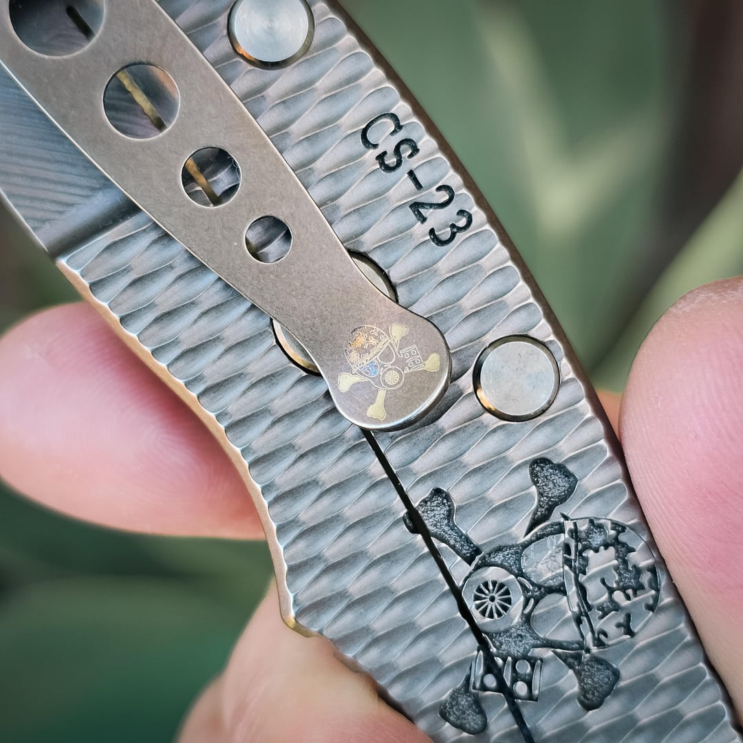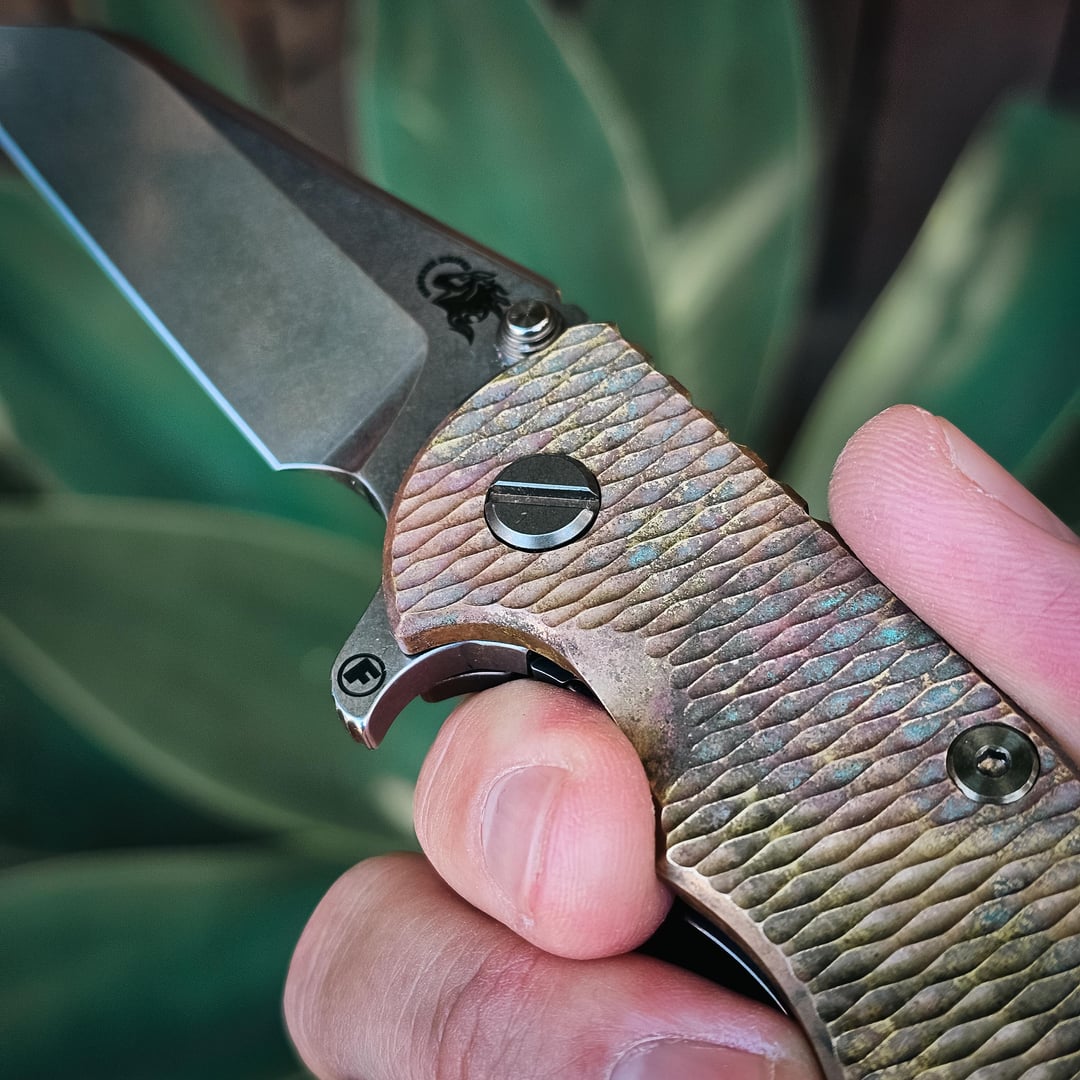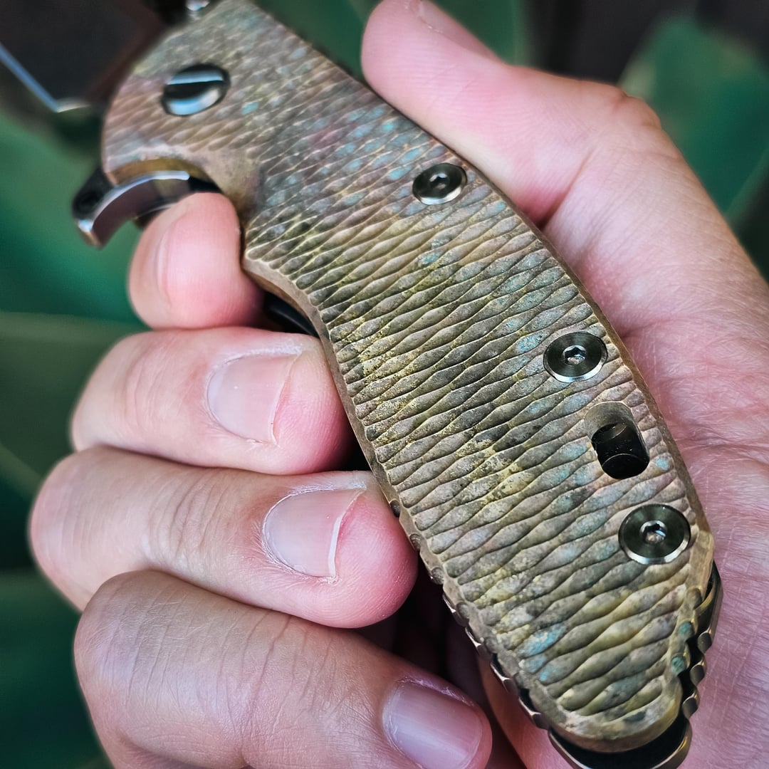 I’ve wanted a scale to match the “contamination” theme for this knife for a while. I recently became interested in patinas on knife materials and wanted to give it a try.