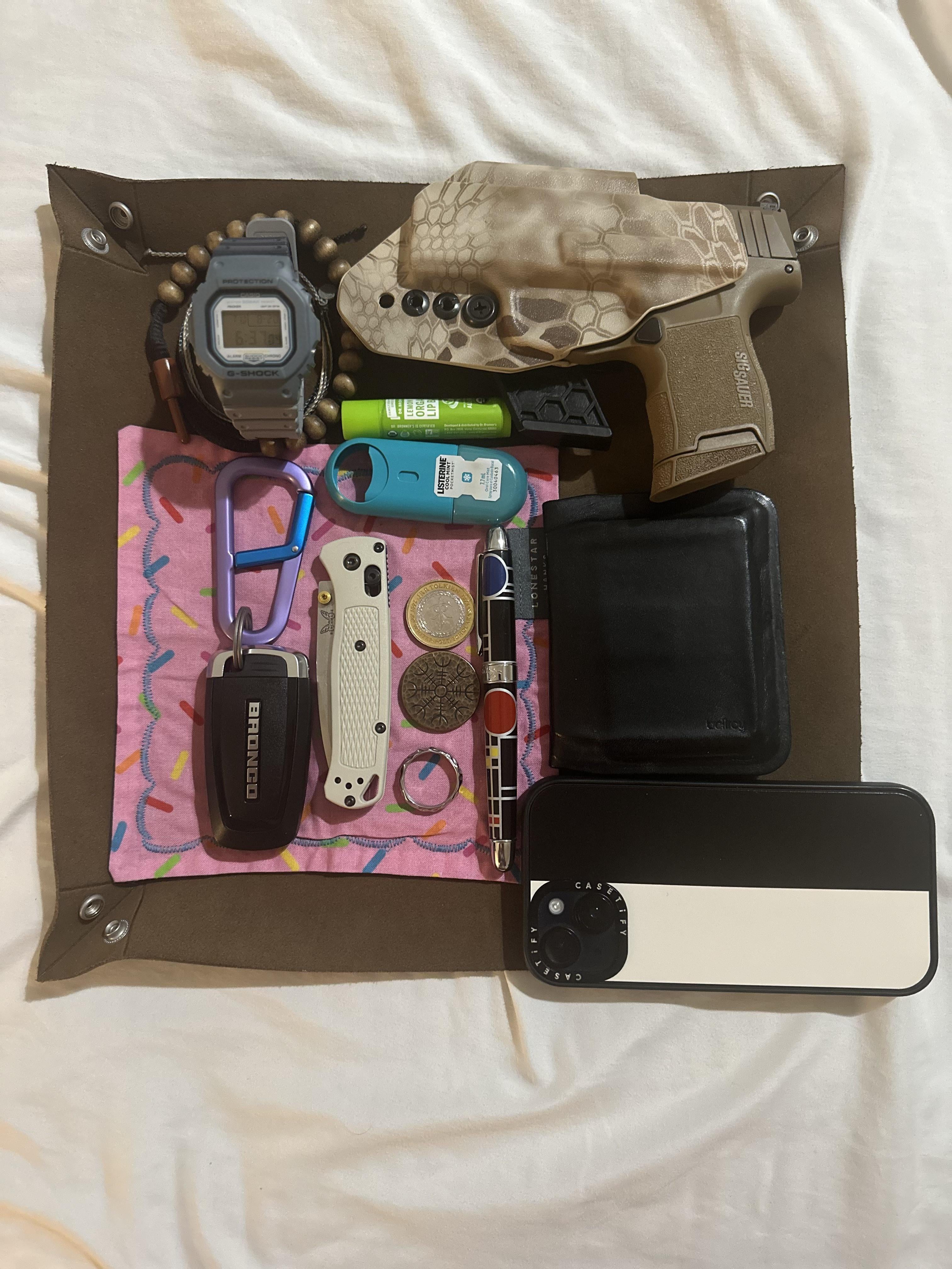 Gshock Watch, Rasaclat Beads, pura vida dog rescue bracelet (for my 18 yr old dog who passed away), lip balm and breath spray, LOTR King Charles Coin, Helm of Awe coin, Donut Hanky, wedding band, Bellroy wallet, Jame Brand carabiner with bronco key, Benchmade Bugout, Work IPhone, Sig 365 with T1c holster, and FLW pen.