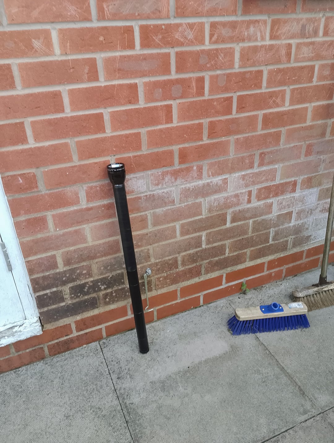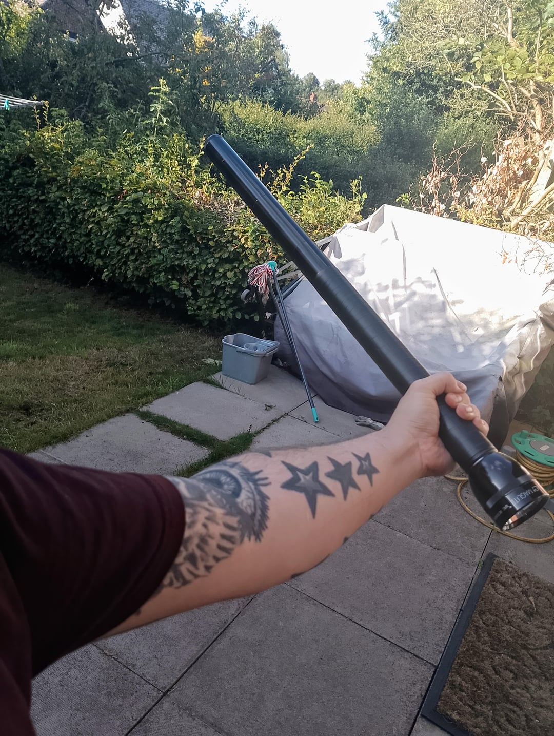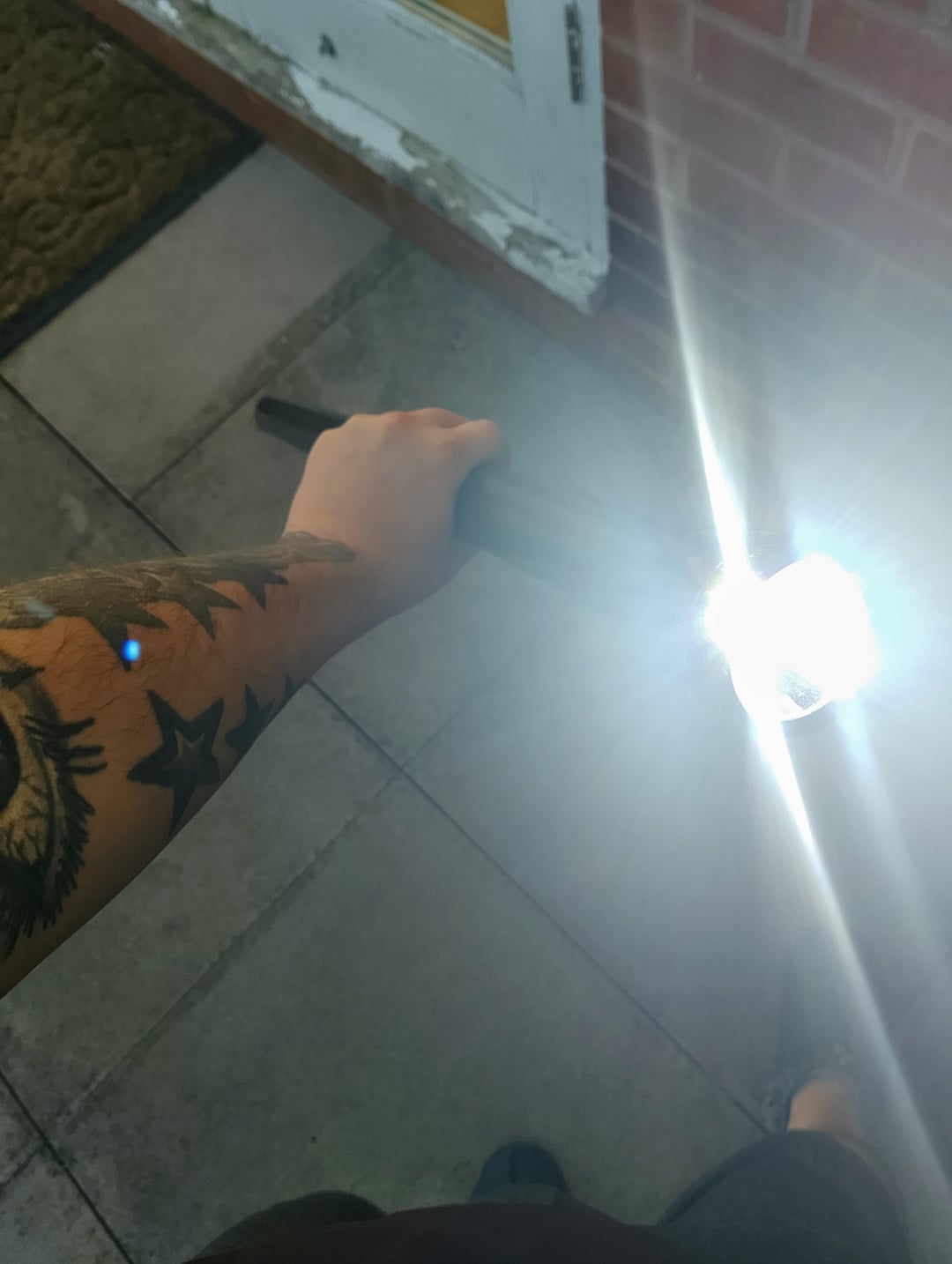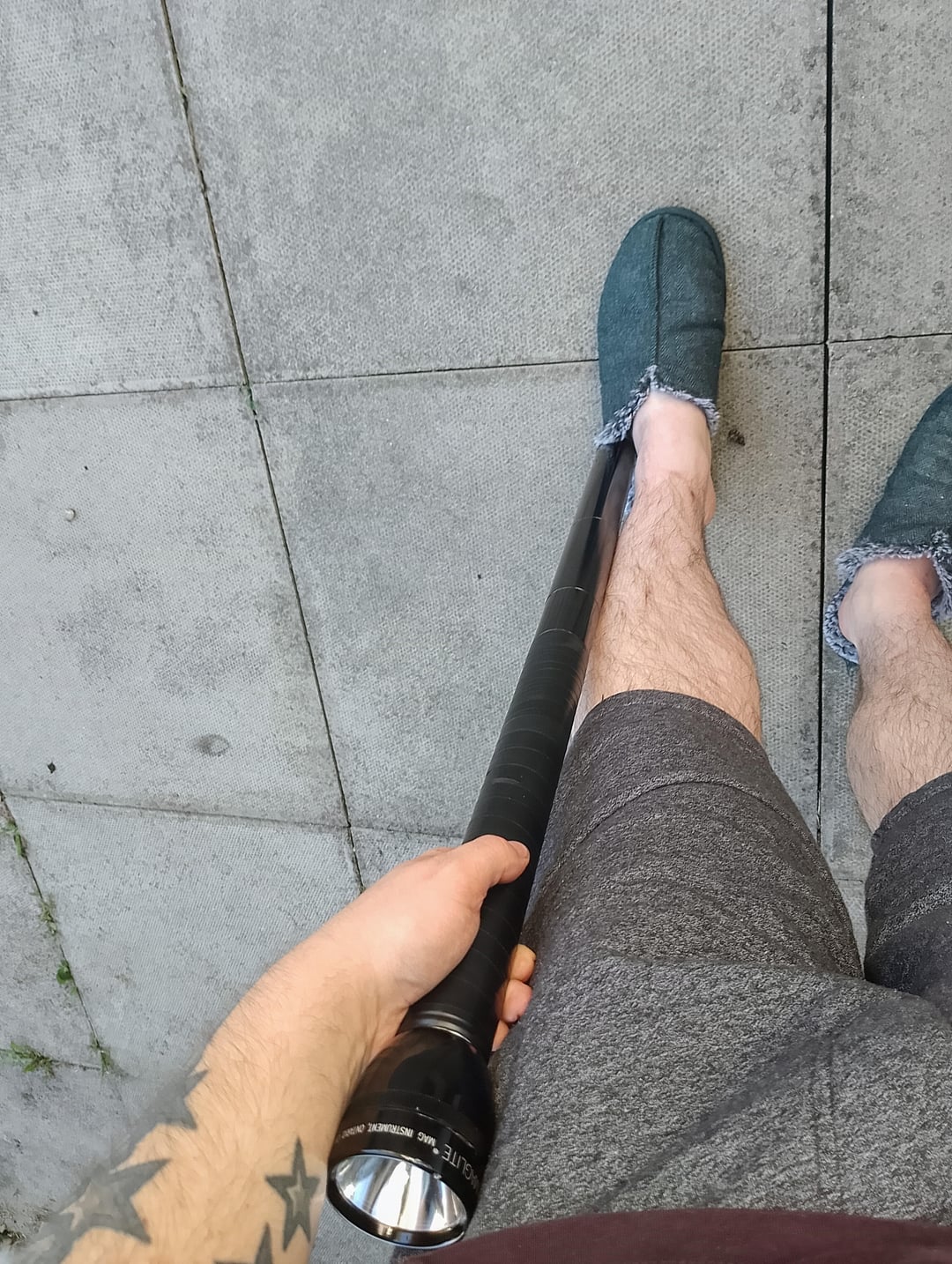 A 10D Cell Maglite, 29″ long with a lumenscraft 2000 lumen and 500m bulb…It’s as long as my leg.