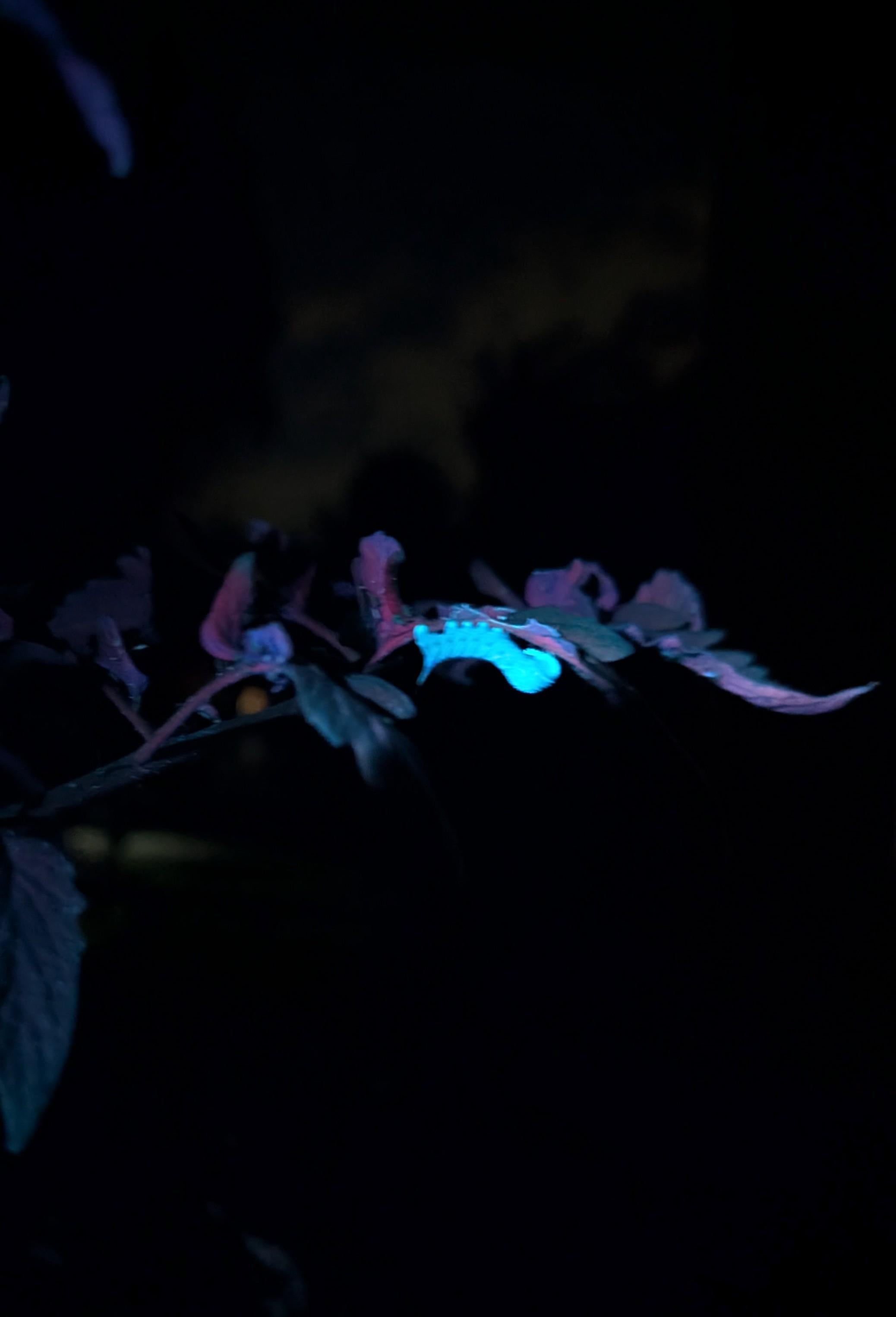 These buggers are near impossible to spot during the day. They can put a hurting on a tomato plant when they get big too. The UV light makes them stand out so it’s easy to keep them off.