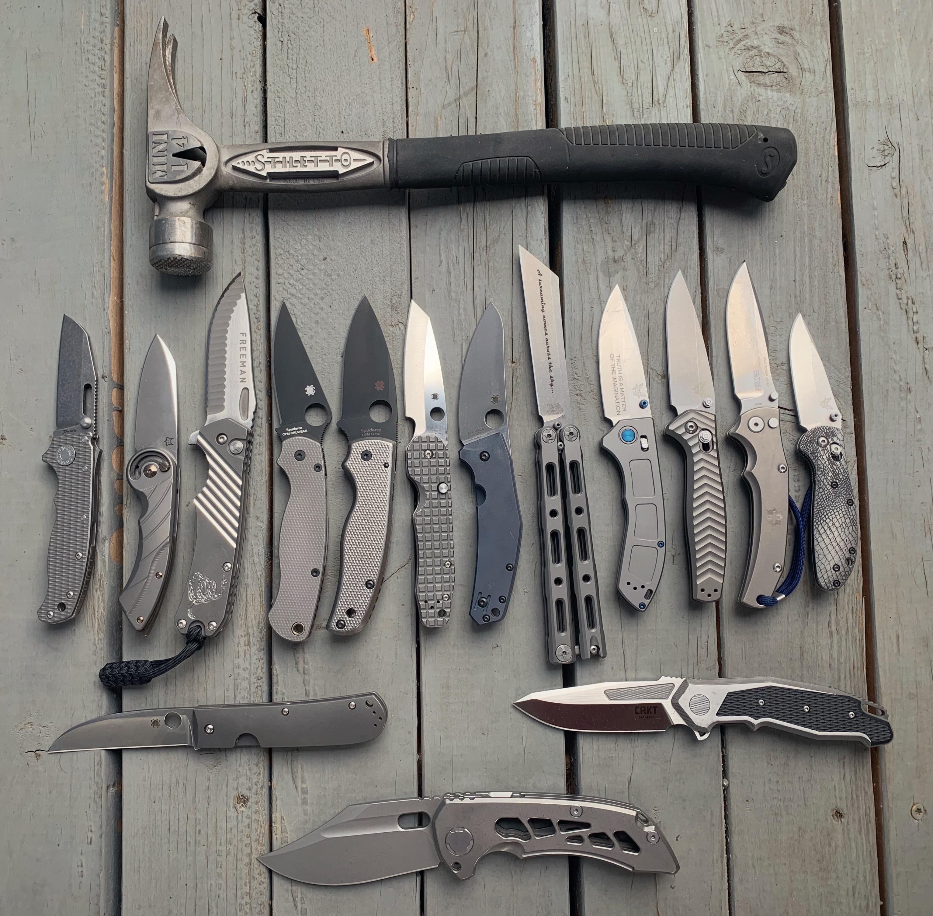 Brainfullablisters 1 year ago The Hammer is a Stiletto TiBone MiniThe knives from L-R are: – Demko AD20.5 – Fox Radius – Freeman Outdoor Gear 451 Button Lock Folder – Spyderco PM2 w/ RGT Scales/clip, RSD backspacer – Shaman w/ RGT Scales/clip, RSD backspacer – Smock w/ Reylight frag scales – Spydiechef – Benchmade 87 – Benchmade 748 Narrows – Benchmade 781 Anthem Klötzli Messerschmeide Swiss Border Guard Folder – Benchmade 556 Minigrip w/ DNALASERING scales and Glowrhino hardwareMiddle Row: – Swayback – CRKT PanacheBottom Knife: – Infinite Crazy Shark