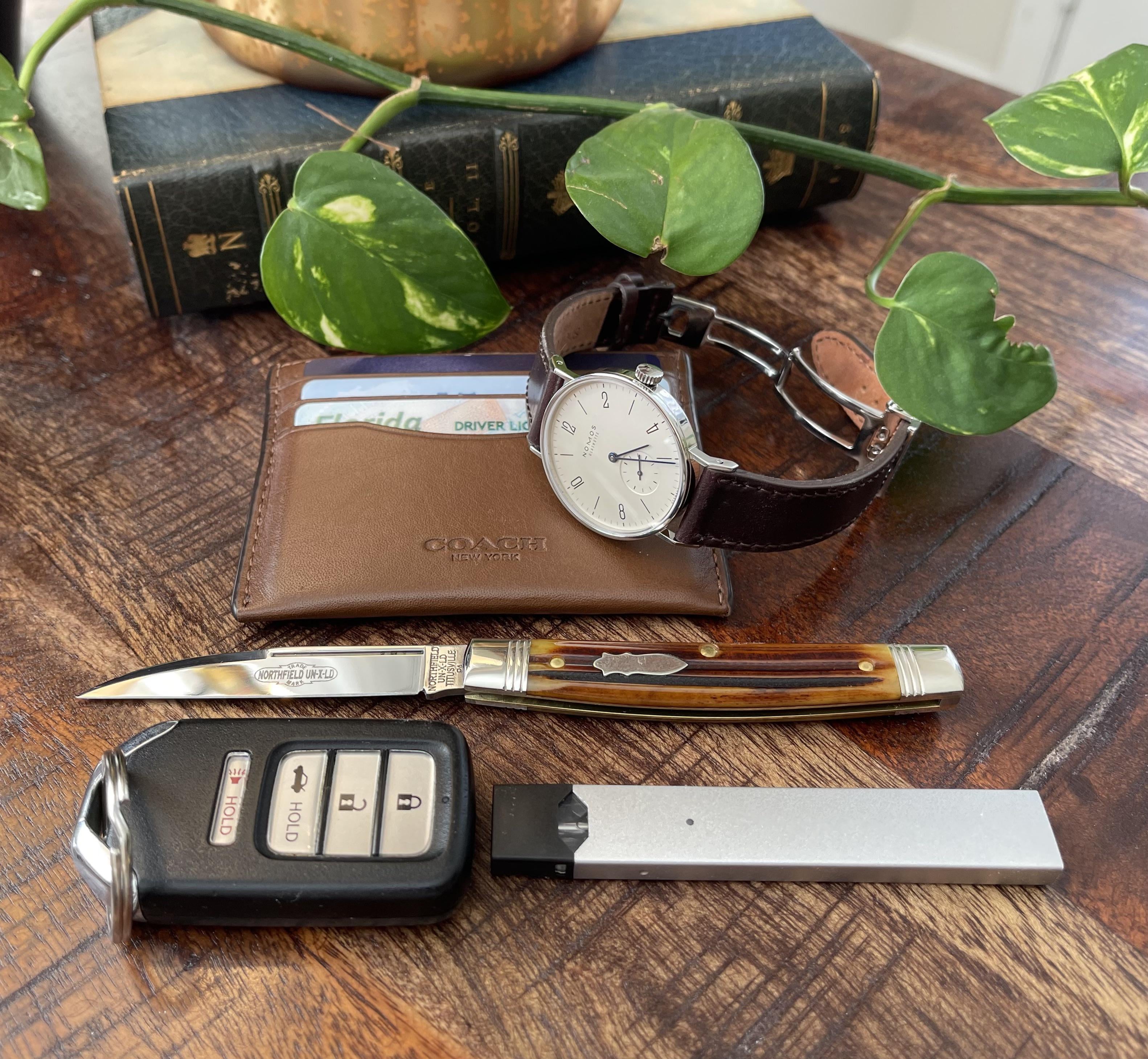 Simple stuff today, GEC #13 “whip”, coach card case, nomos tangente, keys, and juul.
