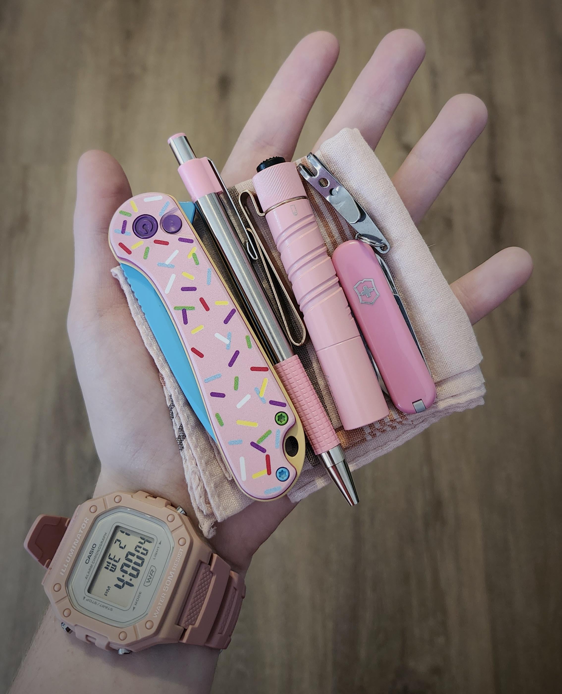 Civivi Elementum dessert warrior, Casio illuminator, Swiss army Classic SD, Olight i3t, Zebra F-301 and a cheapy hanky