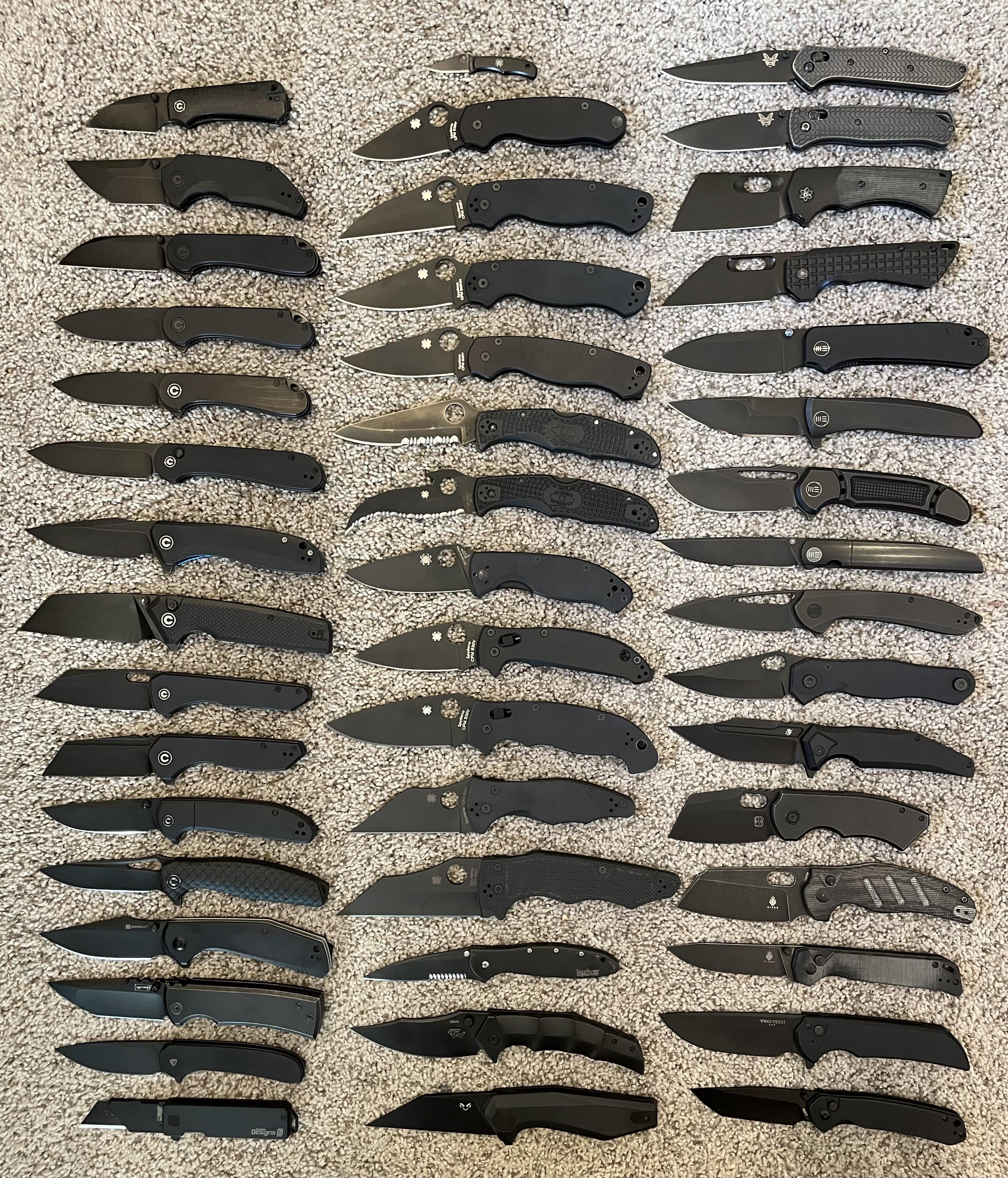 RilohKeen 1 year ago What can I say, I like black.Brands from top to bottom, left to right, Civivi, Sencut, Chaves, Ferrum Forge, Exceed Designs, Spyderco, Kershaw, Drop, Damned Designs, Benchmade, EMPEDC, WE, Quartermaster, Arcane Design, Berg Blades, Kizer, Protech, CJRB.