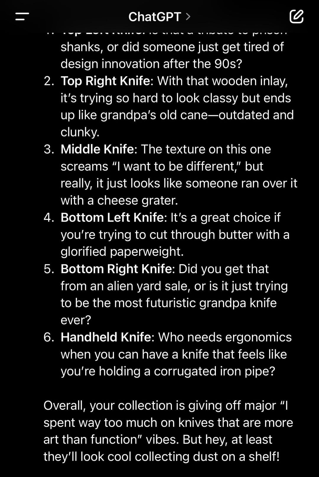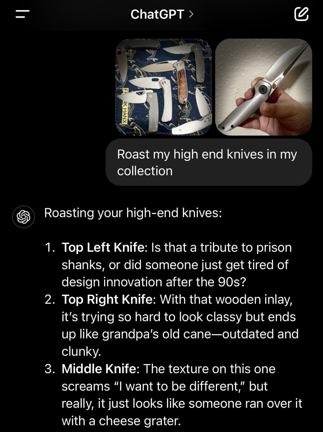 In KNIVES Oh my god, why does this cut so deep? ππ August 25, 2024 I saw someone else post one, so I checked it out, and it seems to have missed the second one, the HMC Transient, as well as the Dukling, from what I can tell. Wow, ouchβ¦. Thank you for the inspiration, u/tu_rtle!by CreepyPoet500 KnifeKnife ClubKnives Prev Post Lightweight carry August 25, 2024 Next Post A Spartan, an Apache, and Japanese walked into a bar… August 25, 2024 Related Posts Some knives I really like January 17, 2026 Metal Complex Giveaway Sh*tpost January 17, 2026 And my best overpriced cardboard cutter isβ¦ January 17, 2026 1 Comment Temporary-Soup6124 1 year ago Funny! The cheese grater and the corrigated pipe made my eveningWrite A CommentYou must be logged in to post a comment.