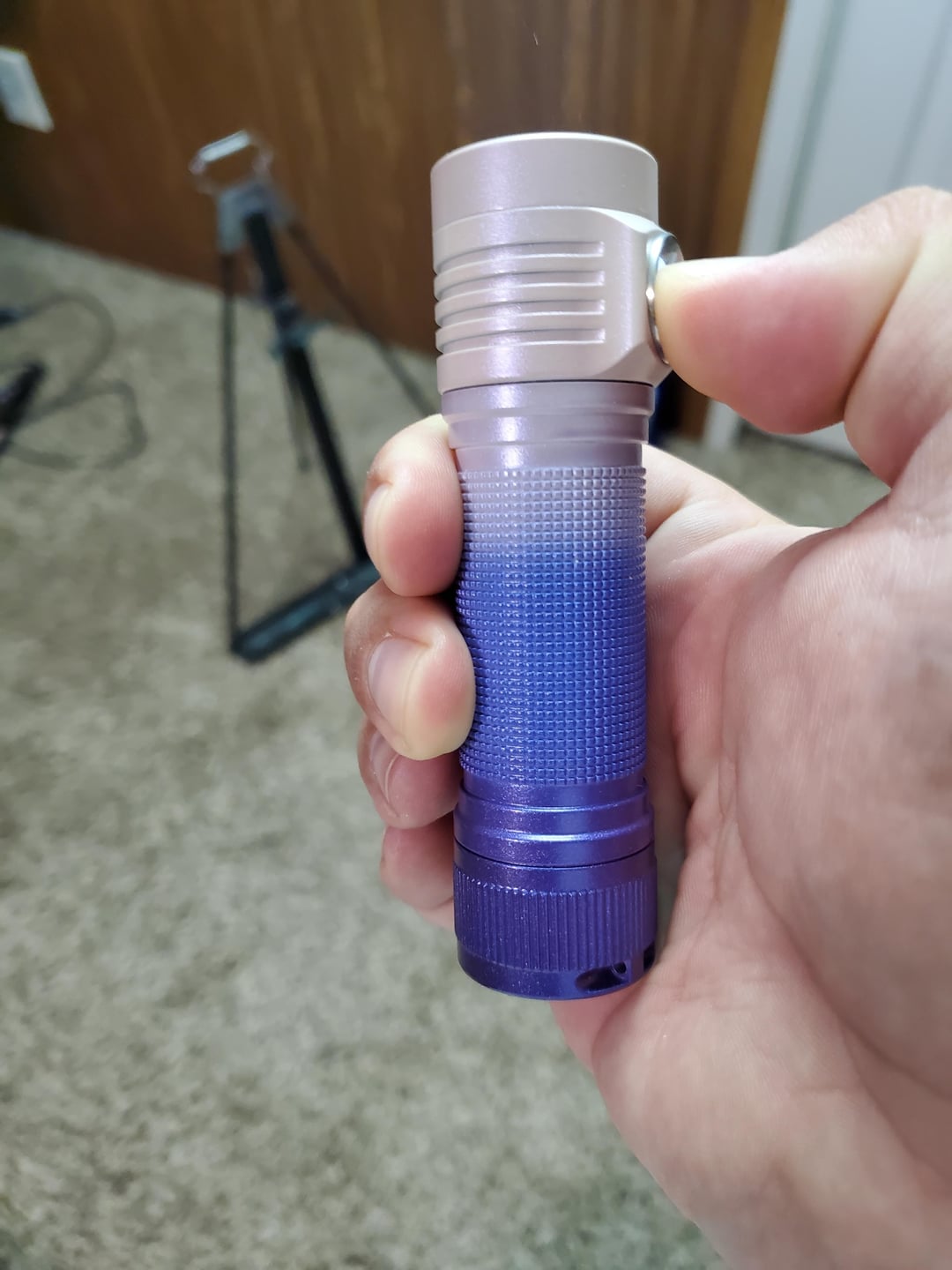 Freshly cerakoted by u/blawdit. The light itself is a beautiful purple. And when it’s heated up you can draw on it with an ice cube lol. One of the things I like about this is that the rough knurling is smoothed out so it doesn’t damage your pocket so much.