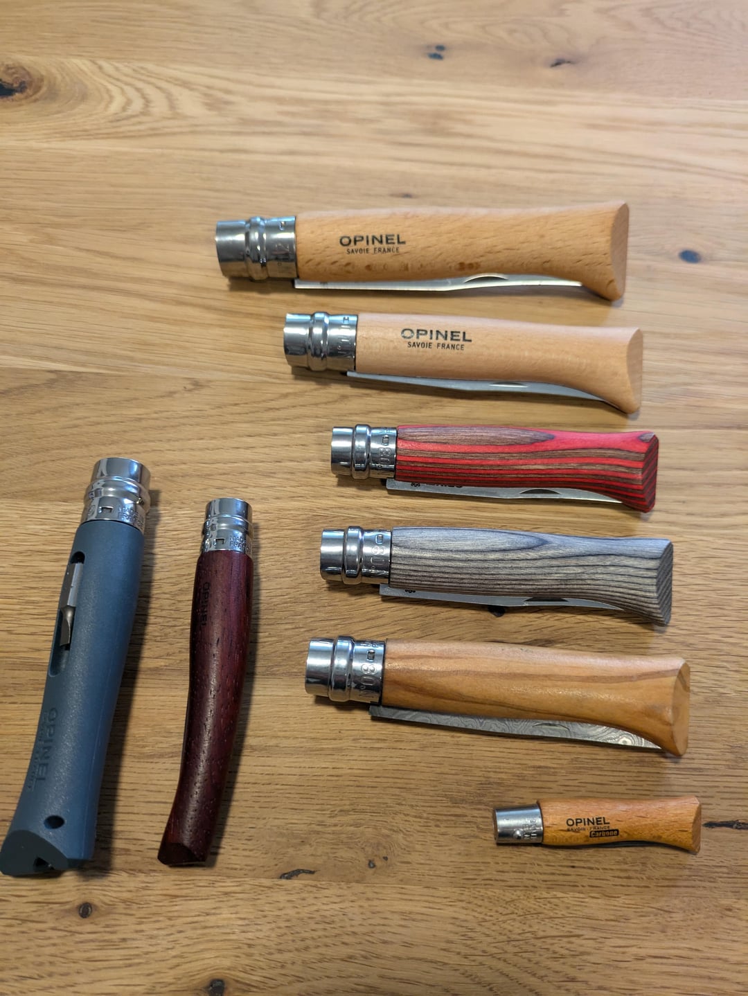nachtwache 1 year ago N°12 InoxN°10 InoxN°08 Inox laminated redN°08 Inox laminated greyN°08 olive wood, rebladed to damscus steelN°03 CarboneN°09 DIYPadouk Effilé 8N°06 walnut wood (photos 3 and 4)