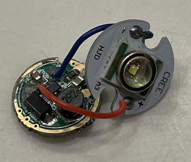 As a follow-up to a previous post (and to be more specific) I’m looking for drop-in parts like this I pulled out of an old flashlight. So far all my searches have left me with the driver OR the LED, but not both together like this.