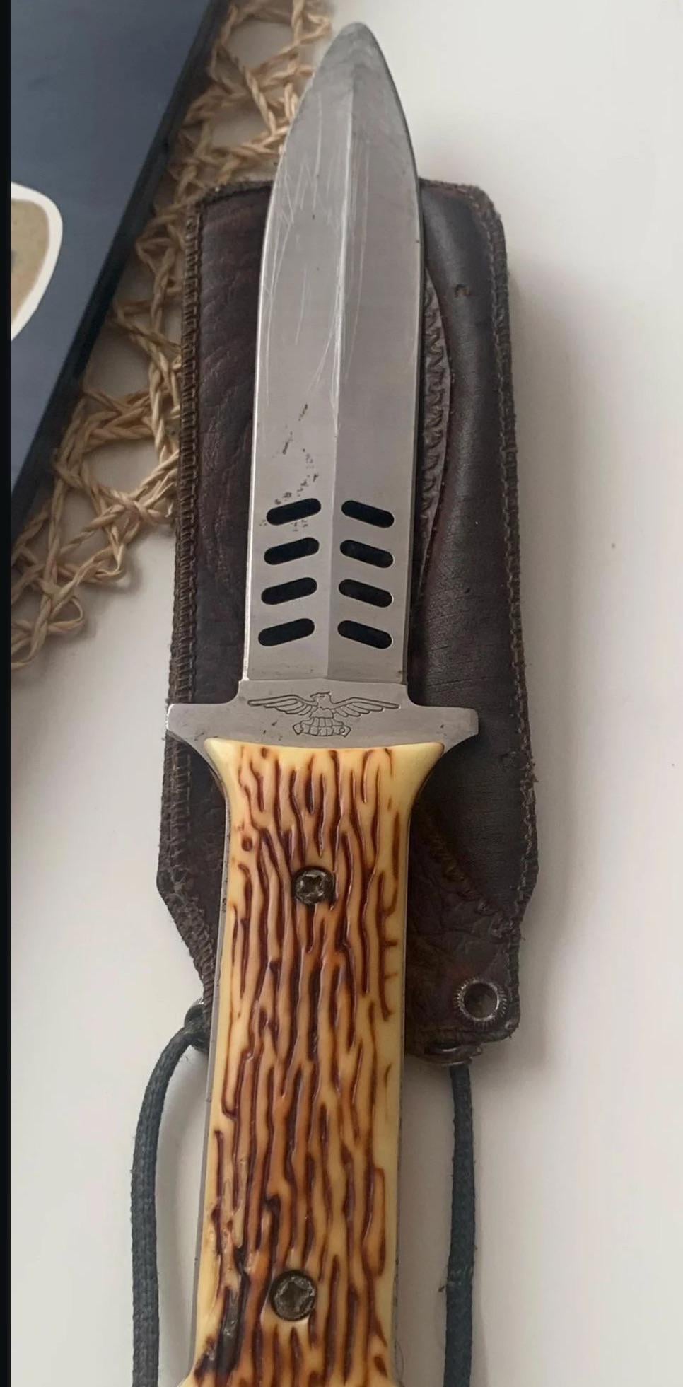I bought this knife at a flea market. It has a leather sheath and it seems old. It has the logo of the eagle and sekizo on it, a japanese brand, but i cannot find anything like this in their current collection. In their older collection i see only single blade knifes. In general i cannot find what kind of knife this is. I was wondering mainly if it was worth restoring the knife and the sheath. Even though it is old and battered it is still very straight and has some sharpness left