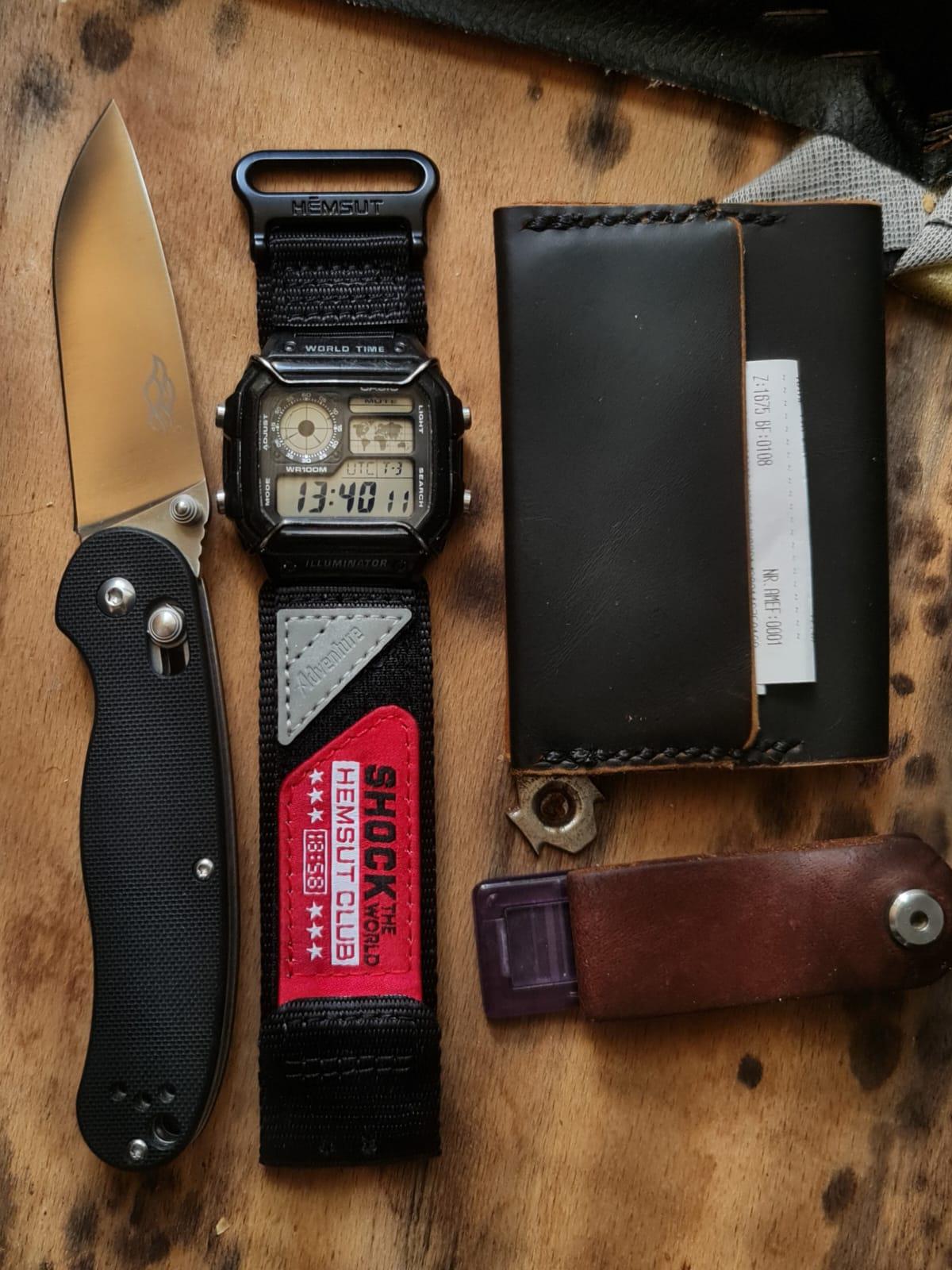 1. Casio Royale AE1200 + Hemsut “Shock the World” Strap + Bullbars (made for the g-shock dw5600e from ALiexpress) 2. Ganzo Firebird FB727s – Rat2 lookalike with an axis lock 3. DIY Leather Wallet / Cardholder 4. DIY Leather Keyholder / Keyorganizer