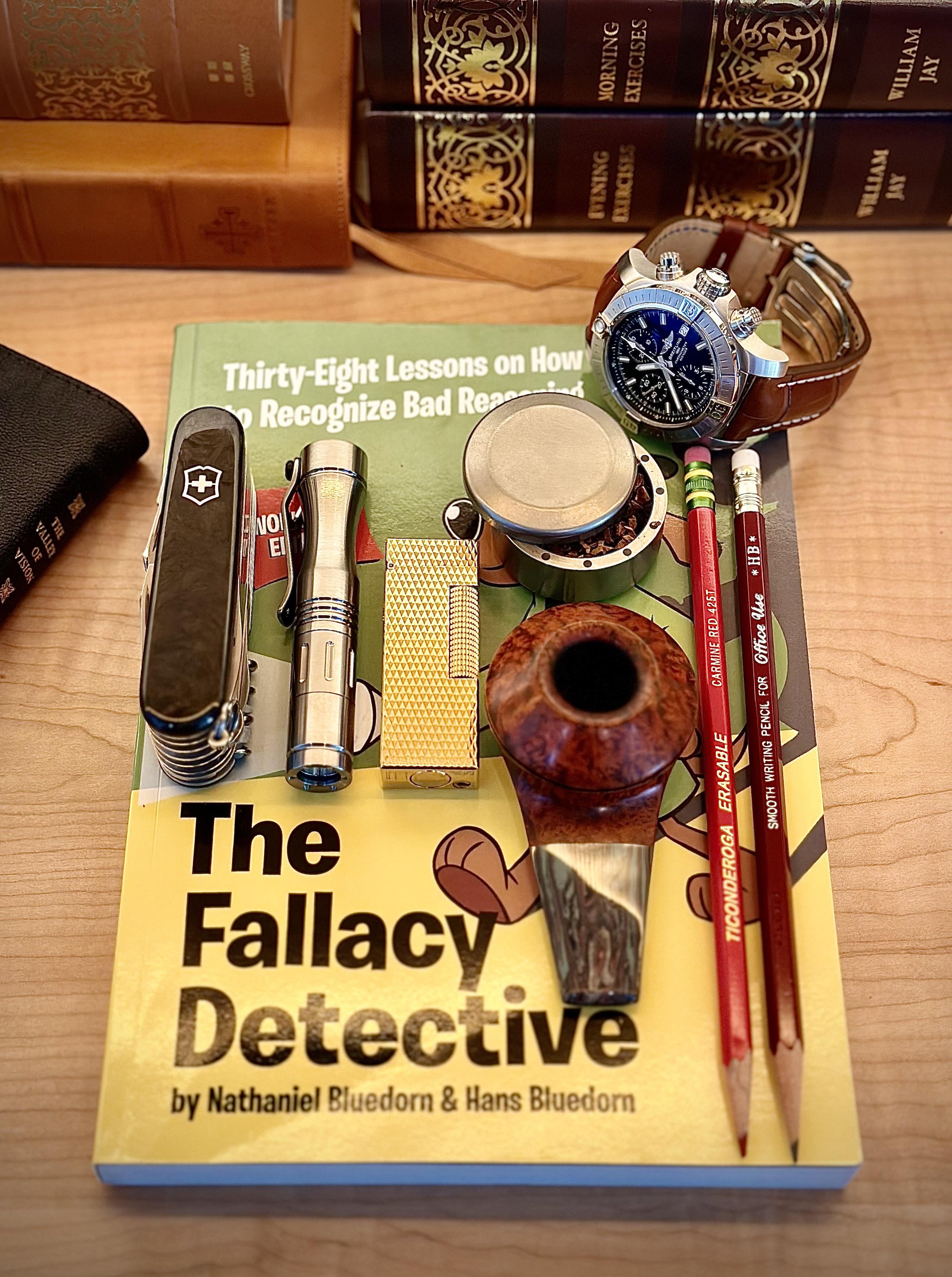 Victorinox Swisschamp w/damascus blade & carbon scales, Dawson Machine Craft Hoku clicky Ti, 18k Dunhill Rollagas lighter, PSD Products titanium magnetic capsule, Walt Cannoy pocket pipe, Ticonderoga red & Mitsubishi 9850 HB, Breitling Avenger Chrono 43mm