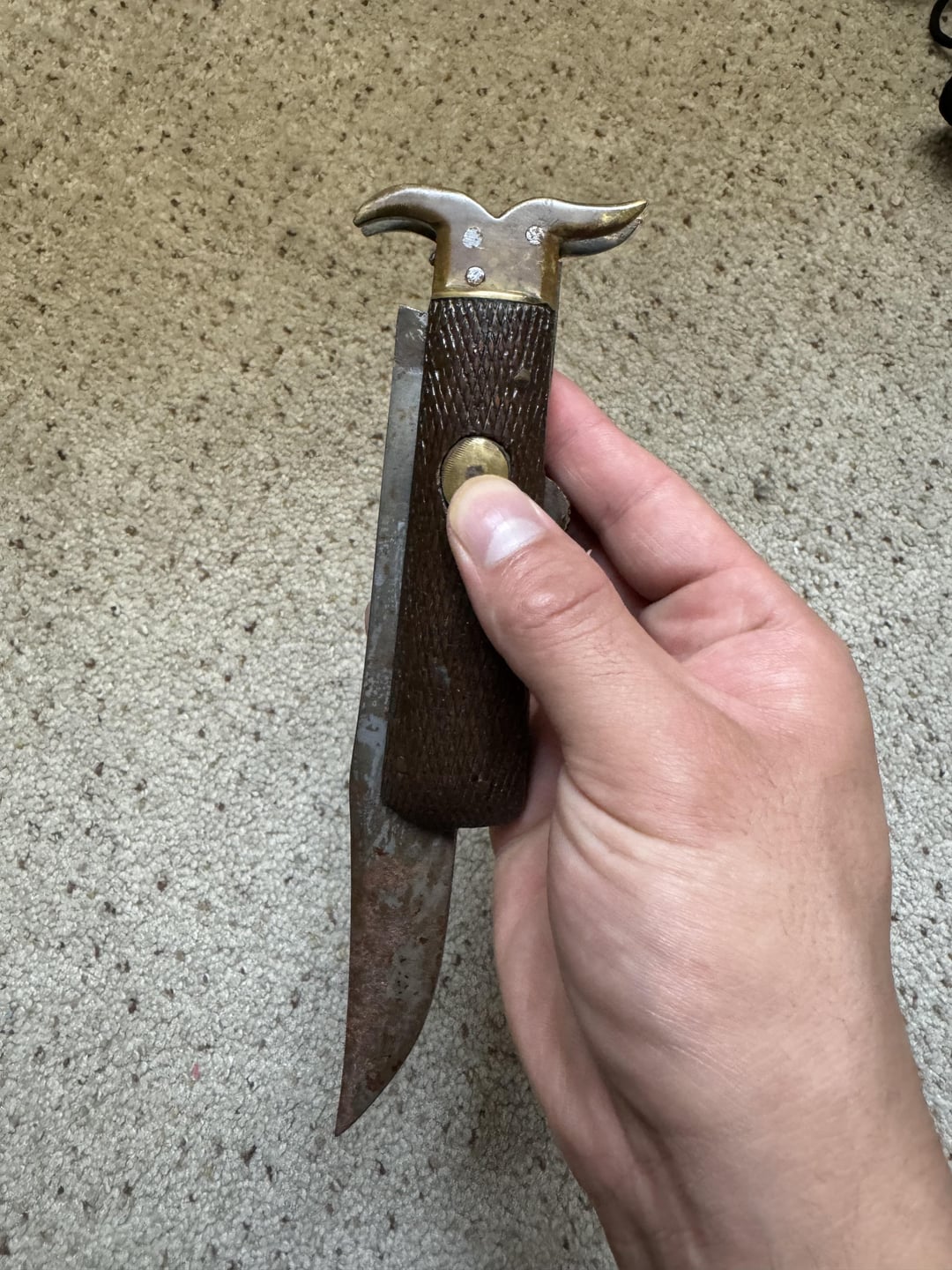 cycle_addict_ 1 year ago https://stcroixblades.com/shop/products/1800s-antique-english-folding-swing-guard-bowie-knife-dirk-old-collection/Similar design. Yours might be newer. It’s certainly OLD and interesting