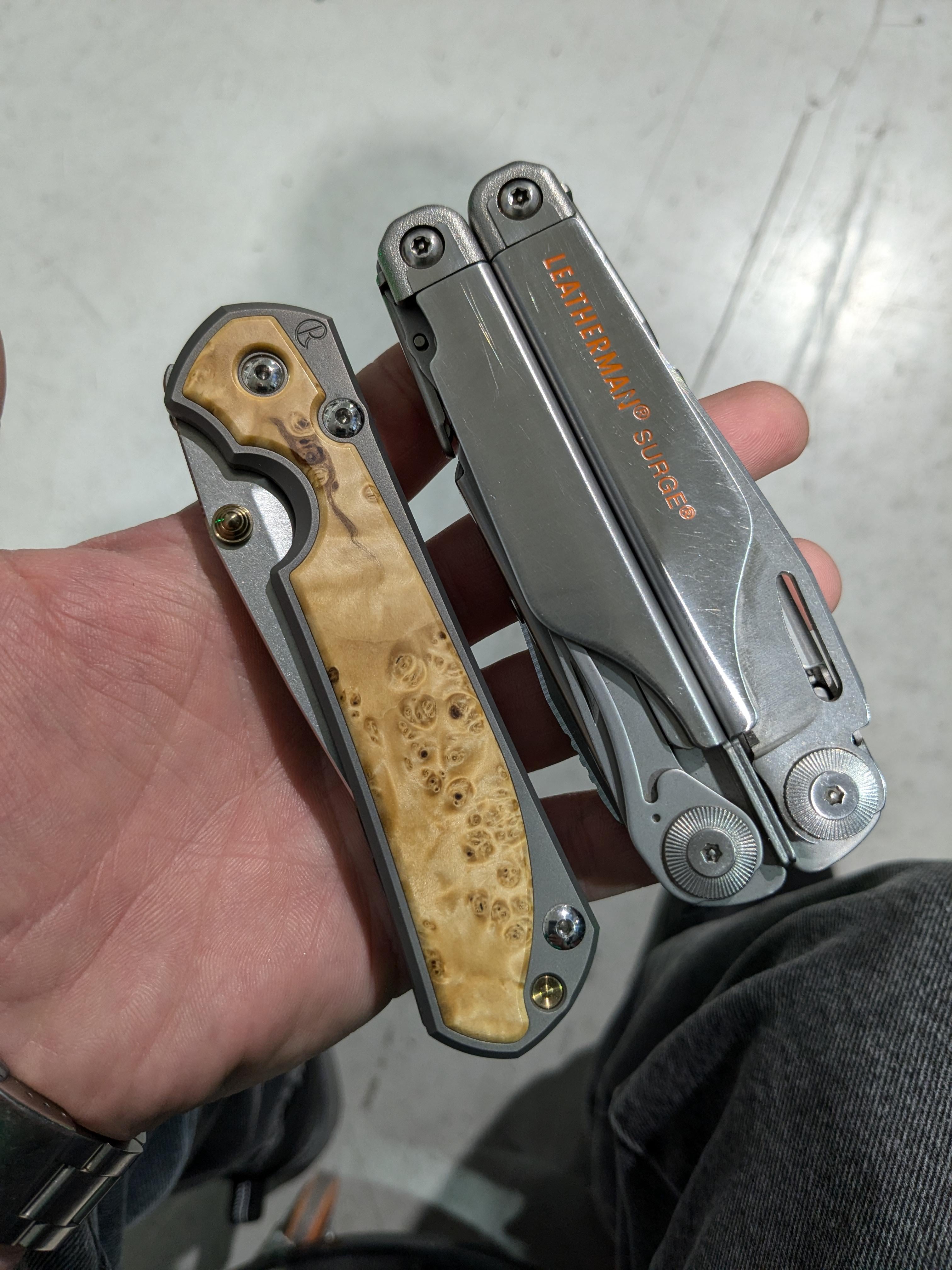 Large 31 Box Elder in magnacut, and Leatherman Surge.