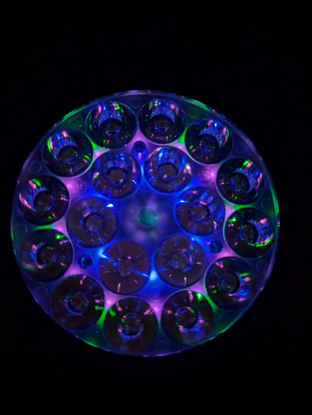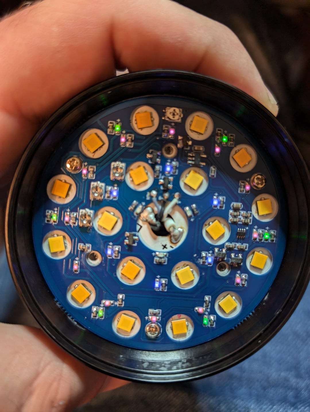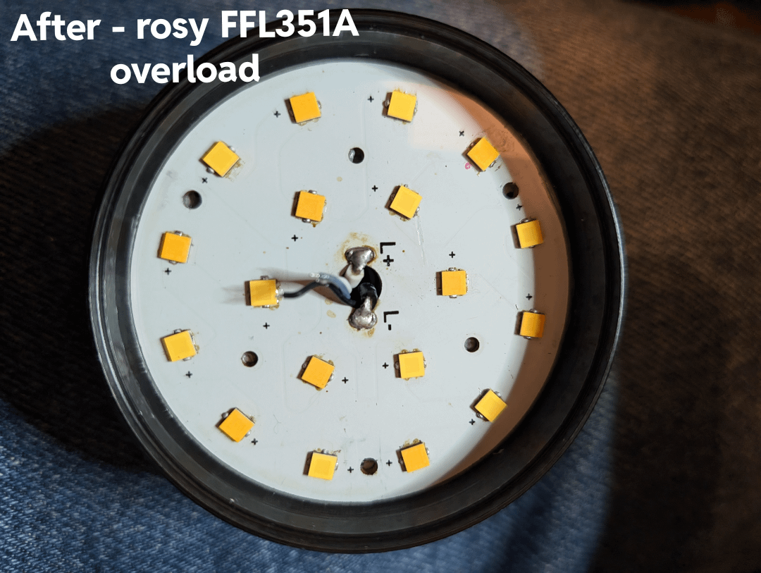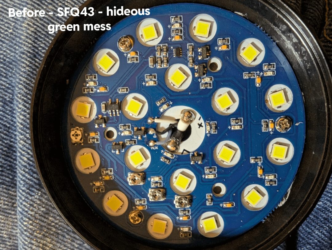 I mixed an even number of rosy FFL351A 4000k and neutral 5000k hoping to land somewhere in the middle of both. That more or less happened, about 4400k. I also scavenged a spare green AR lens from a Convoy light to replace the purple AR lens that came with it. The result seems a vast improvement over the stock super green SFQ43.