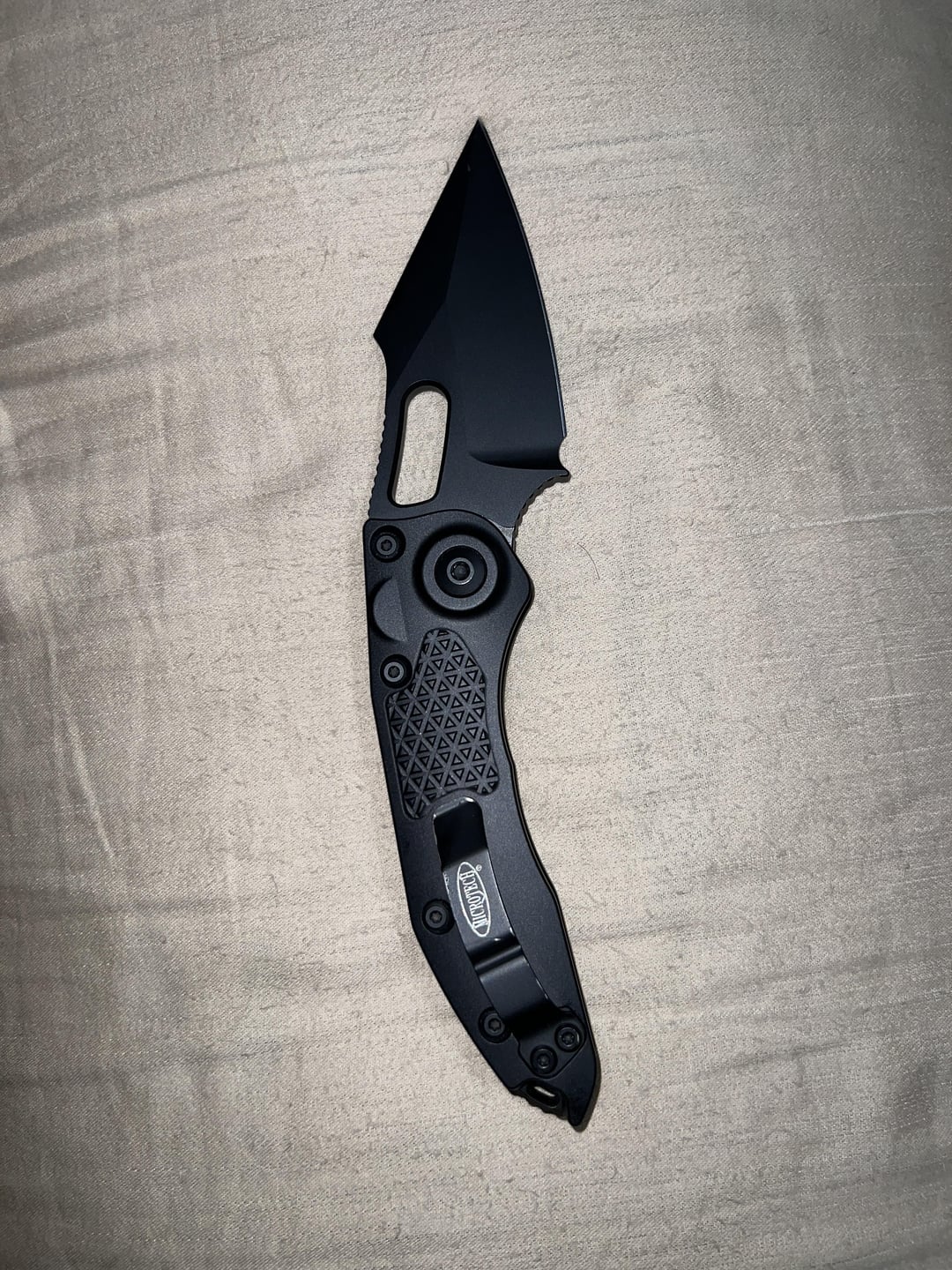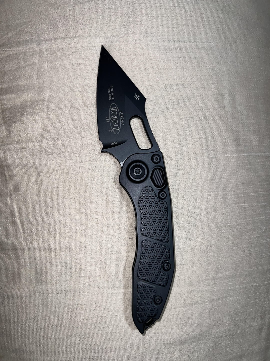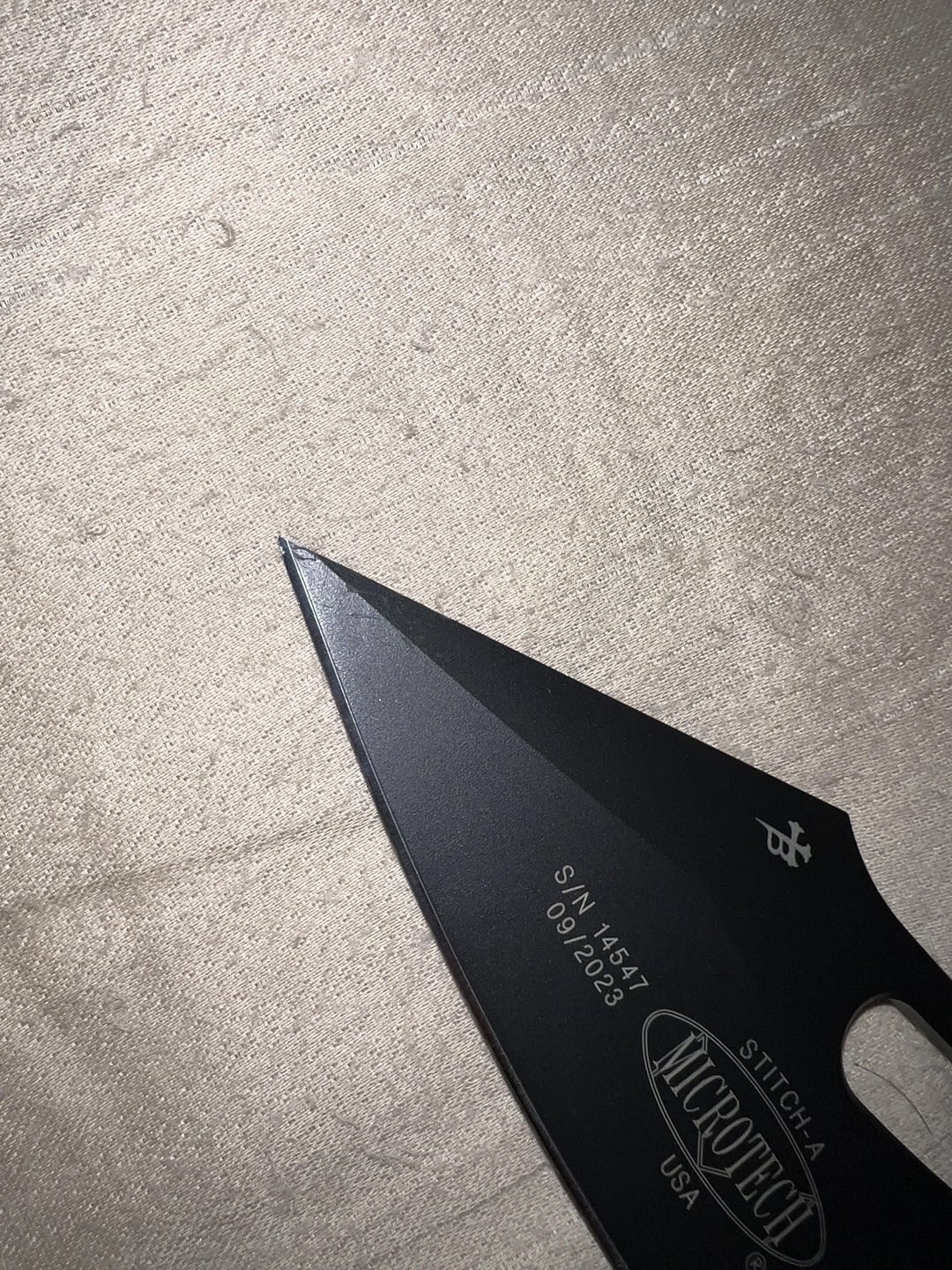 Got a Microtech stitch tactical black aluminum handle if anyone is interested at all I’ll let it go for a great deal because I want to ship it tomorrow or as soon as possible Only issue it has is a couple snail marks on the tip or front of the blade some of the black paint came off and slight wear on the clip but overall still factory razor sharp only carried about 3-4 times