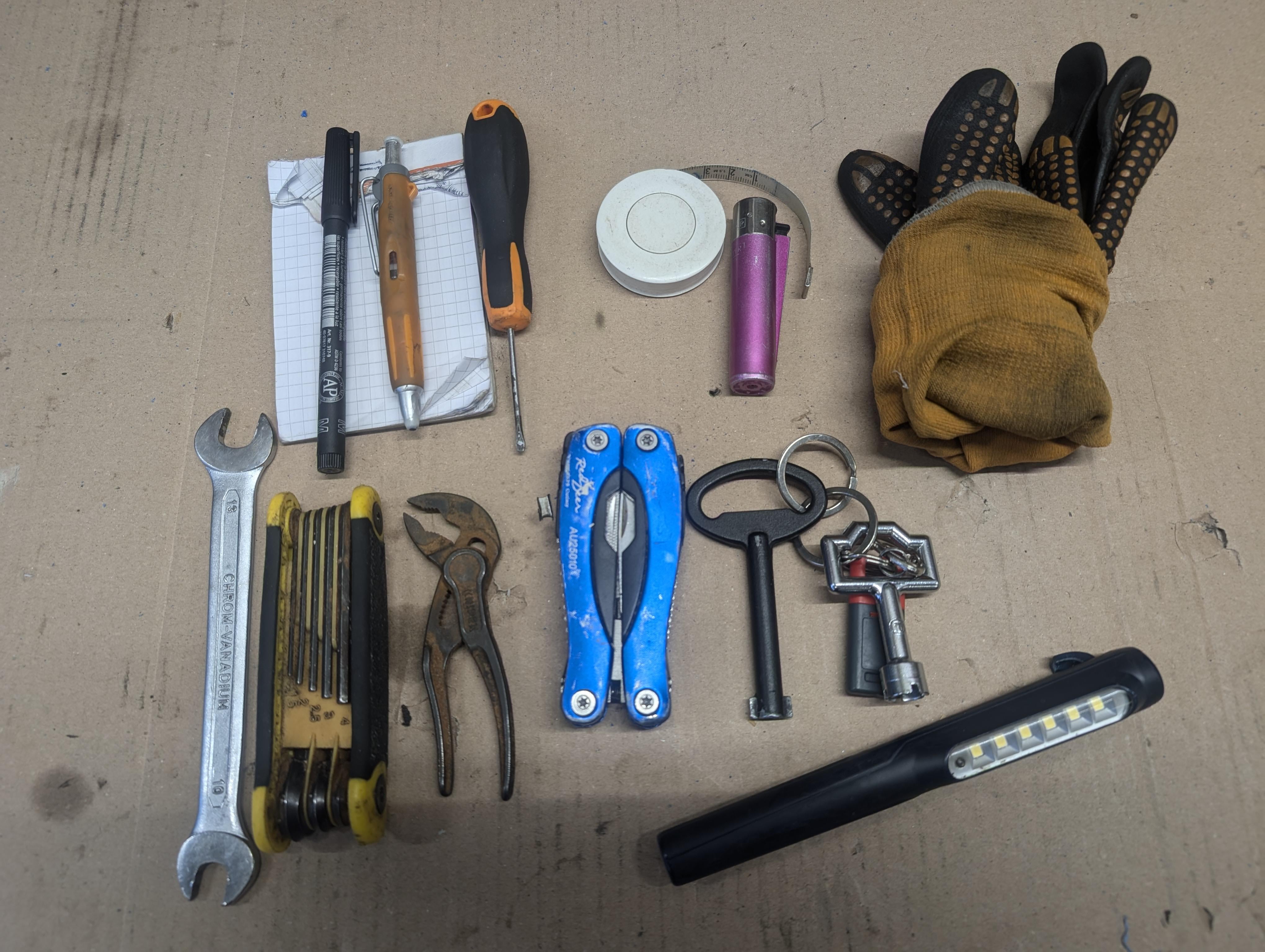 Marker pen, Tombow AirPress biro, Mini notebook, Disposable lighter, Measuring tape, Spanner 10/13mm, Stanley pack of Allen keys, Knipex Cobra mini, Electric cupboard keys, Penlight, Work gloves, Crappy multitool