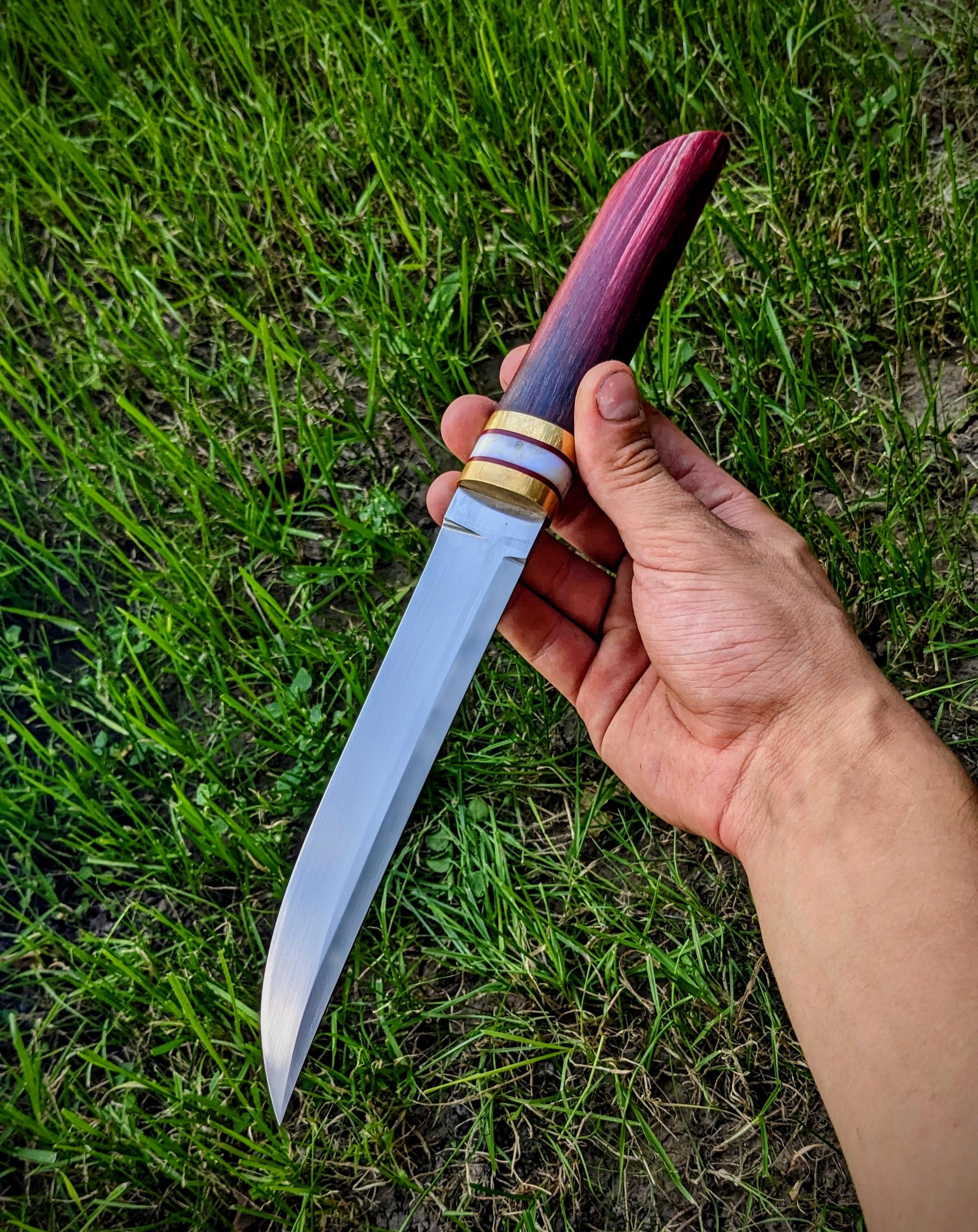 I have finally fixed my other phone with better camera! Here are better picture of my handmade Kaiken! N690 steel, 60 hrc with hand satin. Brass, white, red micarta and red stabilized Karelian Birch.
