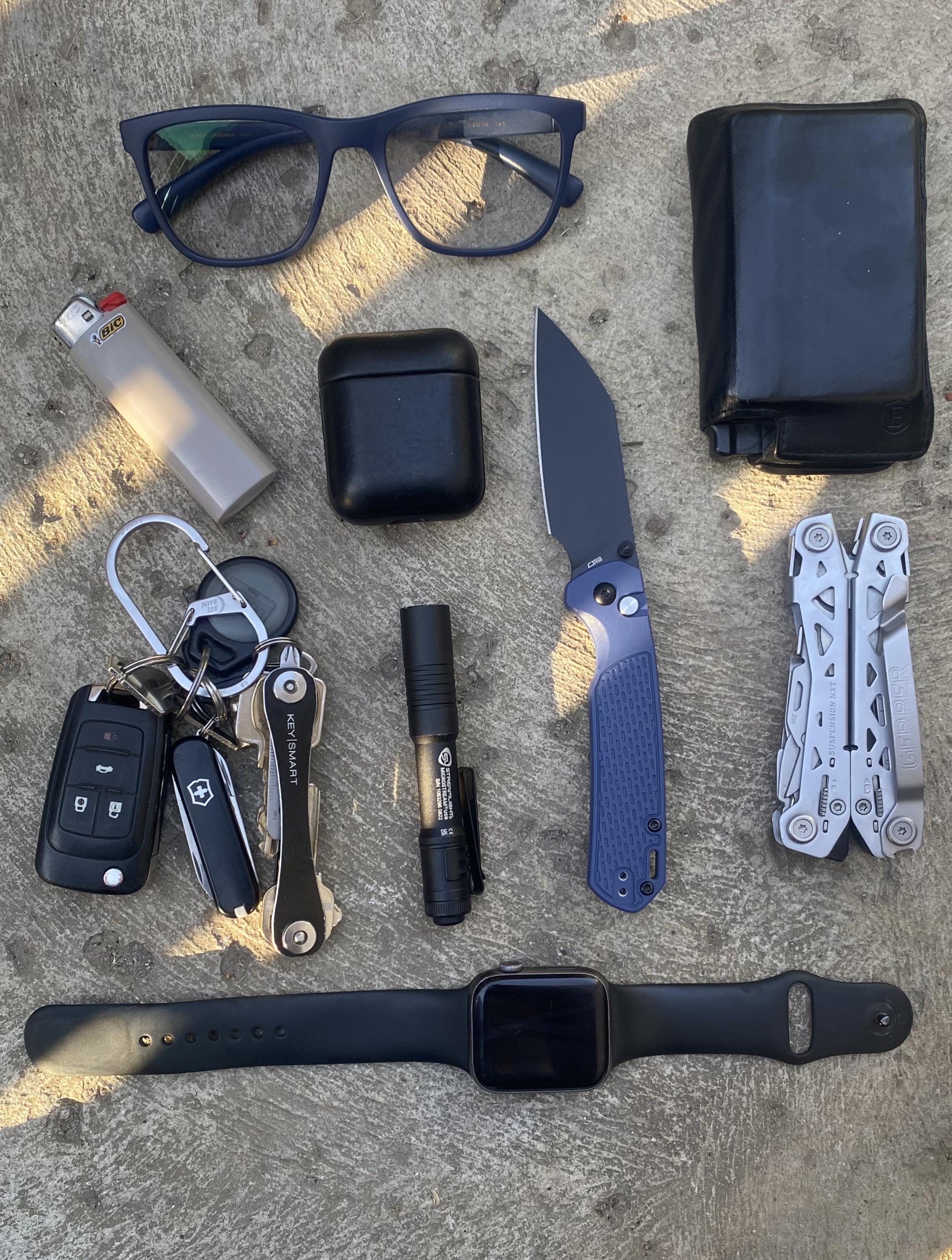Dolce & Gabbana transition lens glasses, CJRB Pyrite-Light Pocket Knife blue, Gerber suspension nxt, bic lighter, Apple Watch, Ekster wallet, AirPods with Nomad leather case, Streamlight microstream usb light, & keys (Nite ize G-series carabiner, keysmart key organizer, & Victorinox Swiss Army Classic SD Pocket Knife)