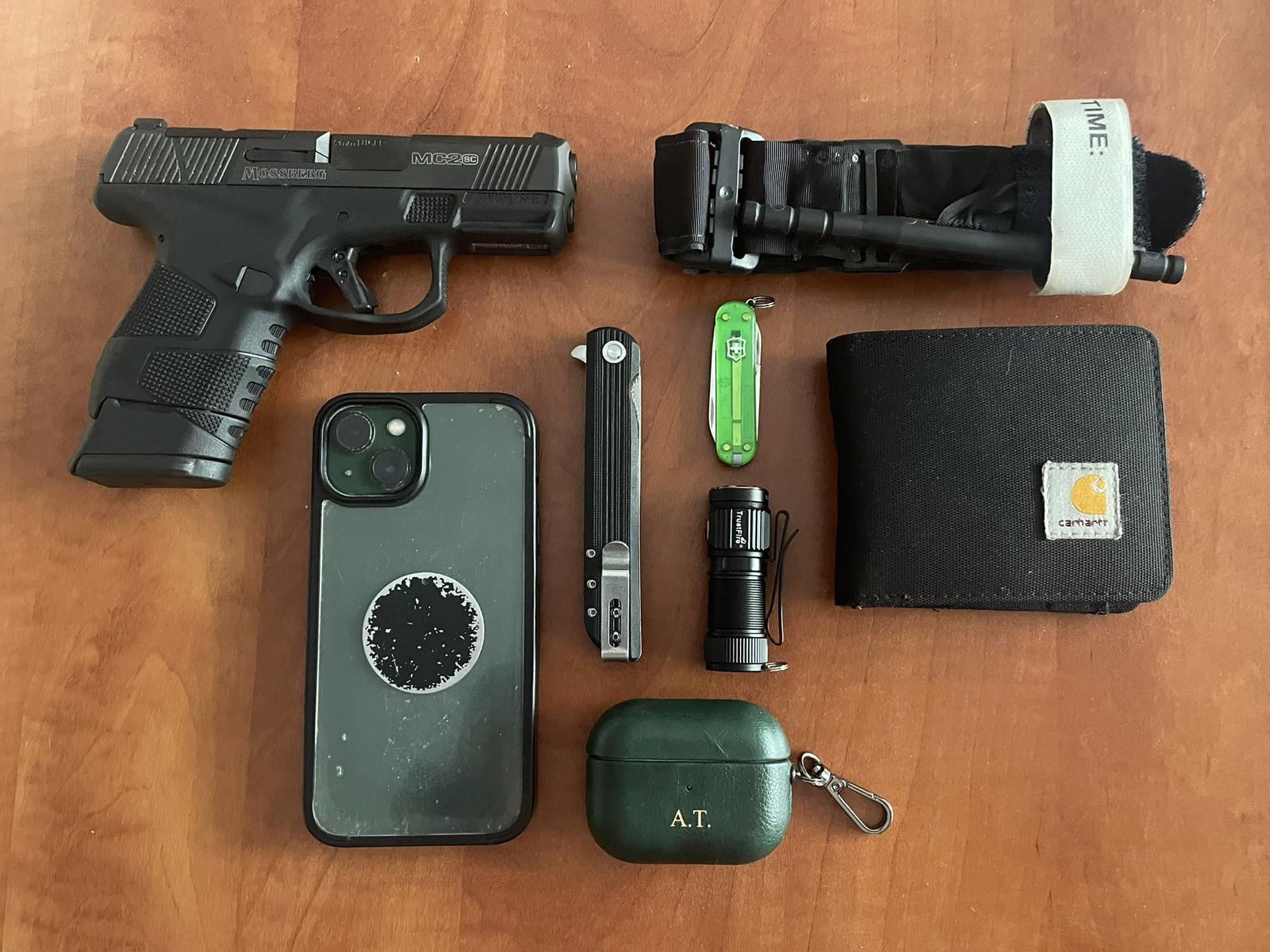 Mossbeeg MC2sc, IPhone 11 with Spigen clear case, CRKT LCK+, AirPods Pro 2, Victorinox Classic SD Transparent, TrustFire T10, Carhartt Wallet, CAT