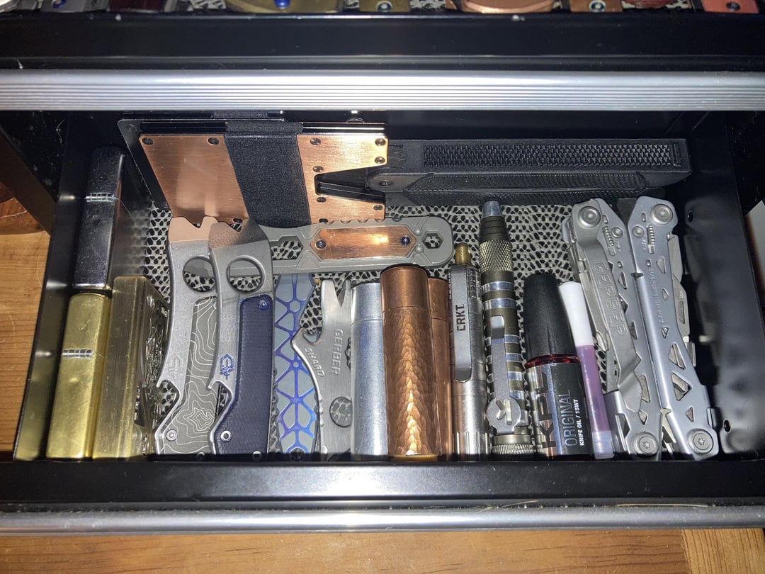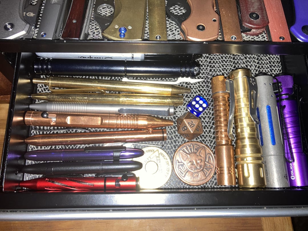 Drawer 1- mostly no name pens, space bullet black and purple, space brass capomatic, refyne copper, olight open red, dango sharpie holder, d6 d2, shire post cat coin, 1yr anonymous club coin, mini pineapple copper, lanapple brass, acebeam rider ti, olight i5t. Bottom drawer- some zippos, some wallets, gerber and olight prybars, ti and copper burts bees holders, Crkt and Kershaw torx storage drivers, gerber suspension, husky diamond stone.