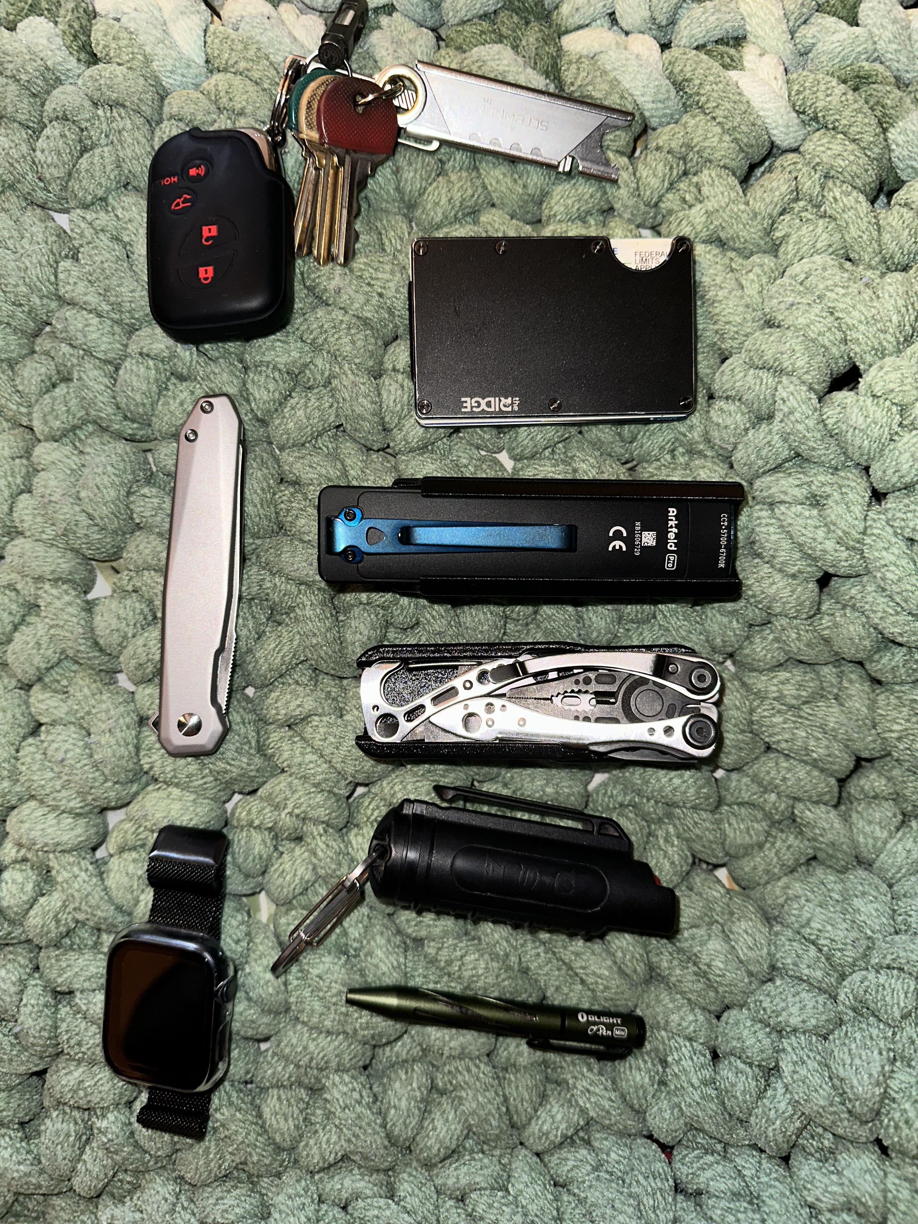 Apple Watch, crkt knife, razor blade for keychain, ridge wallet, arkfield pro by olight, leathermen skeletool, pepper spray, olight pen