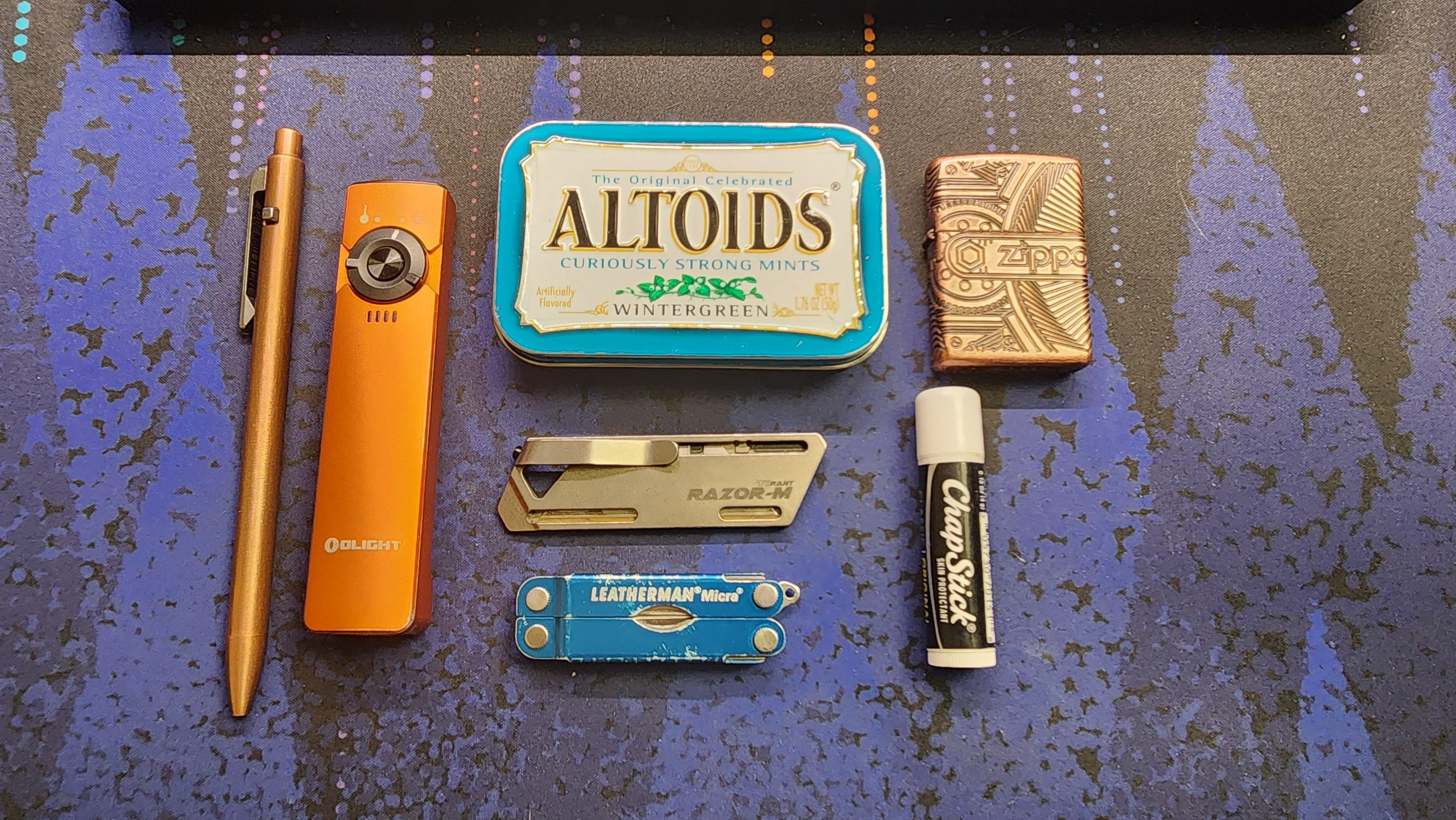 * Tactile Turn copper slim side click * 0.5mm Sharpie S-Gel refill * Olight Arkfeld (the laser one) * Altoids tin organizer/pocket kit * Bandaids * Alcohol wipes * Ibuprofen * Acetominophen * Antacid * Nail clippers * Uncle Bill’s Sliver Grippers tweezers * Bobby pins * Hair ties * Exceed Designs TiRant Razor-M * Leatherman Micra * Shortened SAK toothpick shoved into the tweezers * Copper gears Armor Zippo * Yellow flame insert * ChapStick