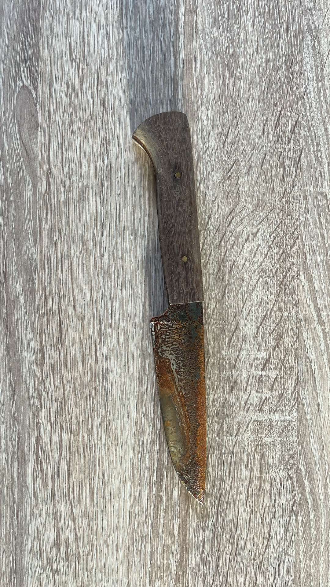 So basically I made a knife from scratch, starting from truck brake pad, then heated and hammered it into a knife ( picture 1 when close to finished ).