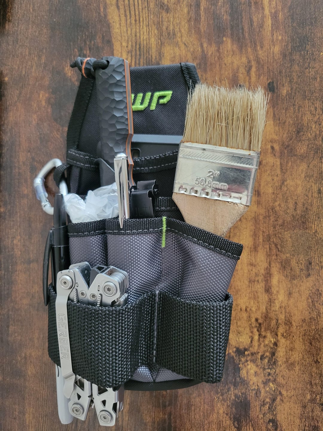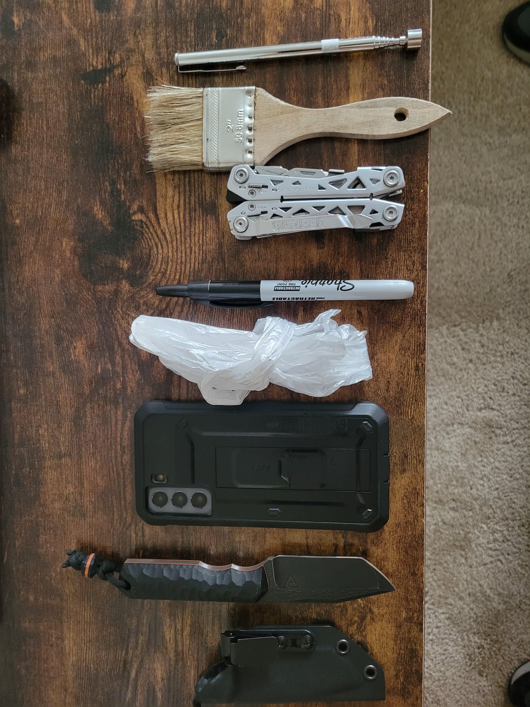 Click sharpie, gerber suspension, cleaning brush, capture bag, extendable magnet, VP custom knife, work phone.