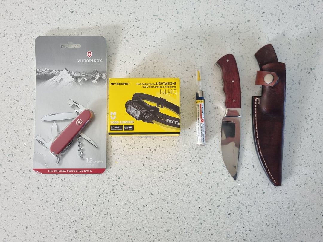 I entered a local EDC photo competition and I won first place! 1. Victorinox Spartan. 2. Nitecore NU40 Headlamp 3. Nano oil 4. Piet Myburg fixed blade in M390