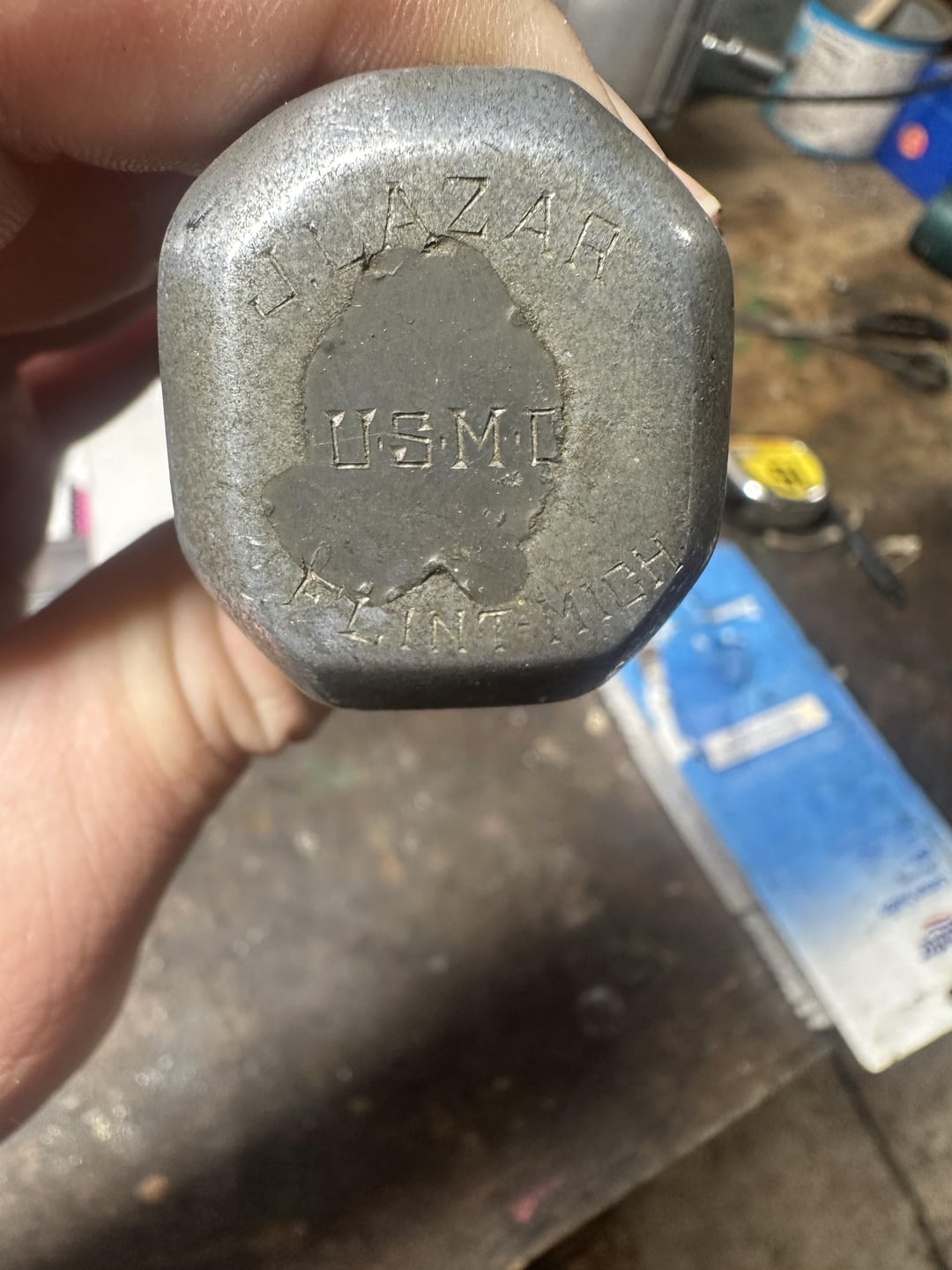 Originally, this knife belonged to the deceased guys brothers who joined the marines during WW2. Growing up they a nieghbor who was a tool and die maker at one of the local GM plants in flint. the tool and die maker used a piece of Spring steal to make the blade. supposedly the story went before the estate owners brother shipped out. The nieghbor gave him this knife with one condition. He said i’m giving you this knife to gut krauts with. Now i don’t know with him being a marine if he actually was stationed in Europe. If that part of the story is true the guy was probably stationed in the pacific.