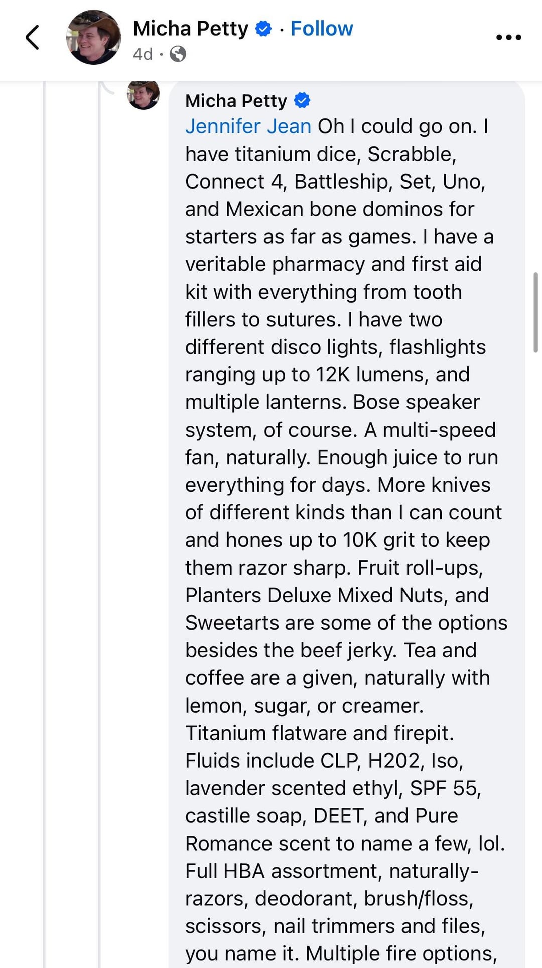 From Facebook, a list: Oh I could go on. I have titanium dice, Scrabble, Connect 4, Battleship, Set, Uno, and Mexican bone dominos for starters as far as games. I have a veritable pharmacy and first aid kit with everything from tooth fillers to sutures. I have two different disco lights, flashlights ranging up to 12K lumens, and multiple lanterns. Bose speaker system, of course. A multi-speed fan, naturally. Enough juice to run everything for days. More knives of different kinds than I can count and hones up to 10K grit to keep them razor sharp. Fruit roll-ups, Planters Deluxe Mixed Nuts, and Sweetarts are some of the options besides the beef jerky. Tea and coffee are a given, naturally with lemon, sugar, or creamer. Titanium flatware and firepit. Fluids include CLP, H202, Iso, lavender scented ethyl, SPF 55, castille soap, DEET, and Pure Romance scent to name a few, lol. Full HBA assortment, naturally- razors, deodorant, brush/floss, scissors, nail trimmers and files, you name it. Multiple fire options, butane torches, plasma arcs, magnifying glasses, etc. Various cordage with a slant towards stronger-than-steel PE line. I could go on like this for a while. 😀