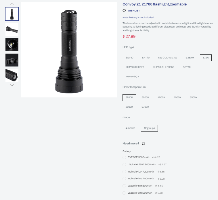 W5050SQ3 or wait for SFT25-R. 12 modes. Molicell P45B is best with an 8A driver, F60 runs a little longer at 5A. Keep in mind the light has kinda bad thermals and 8A will not sustain for long, even though the Z1 uses the fixed 22mm buck drivers.