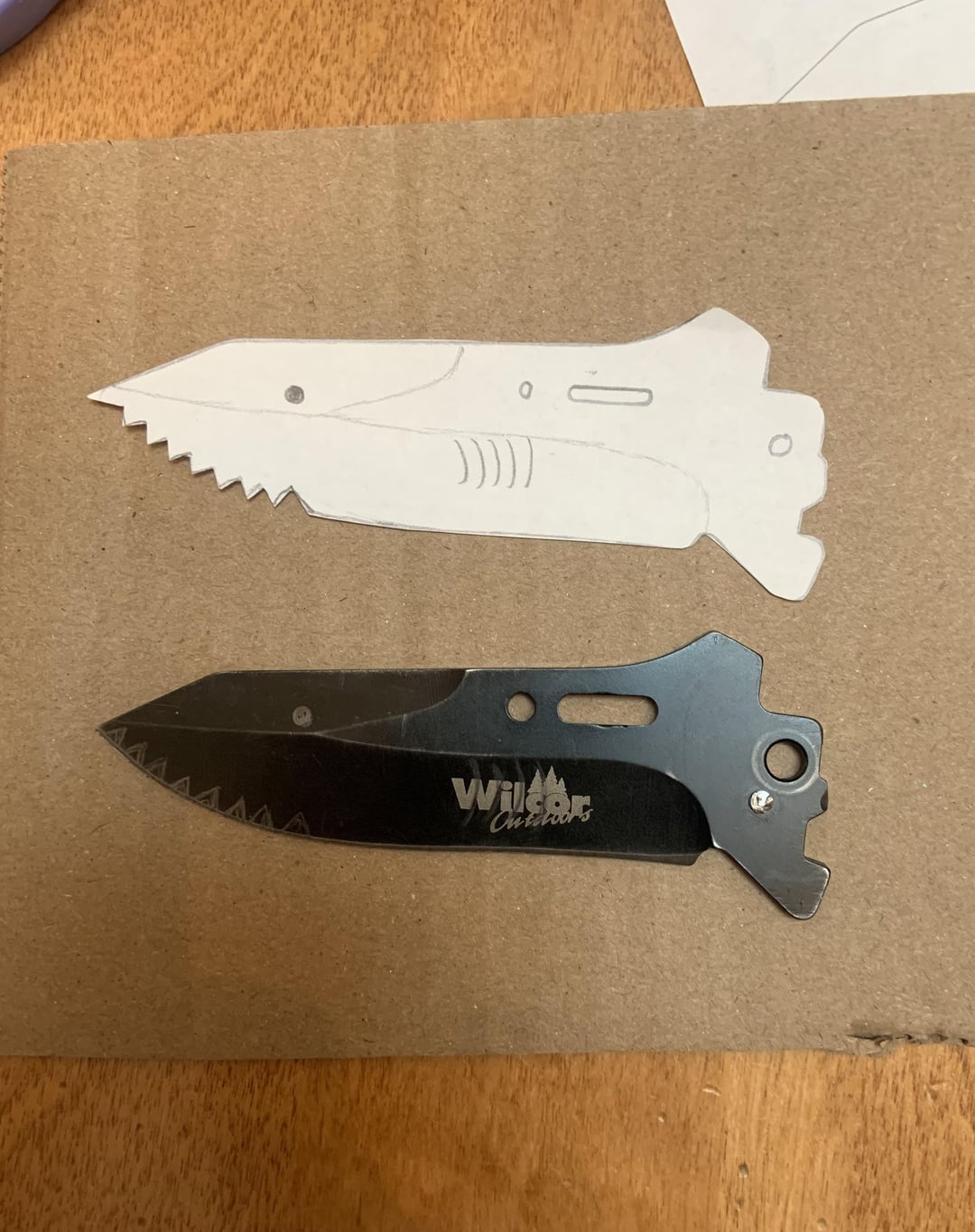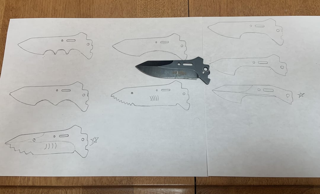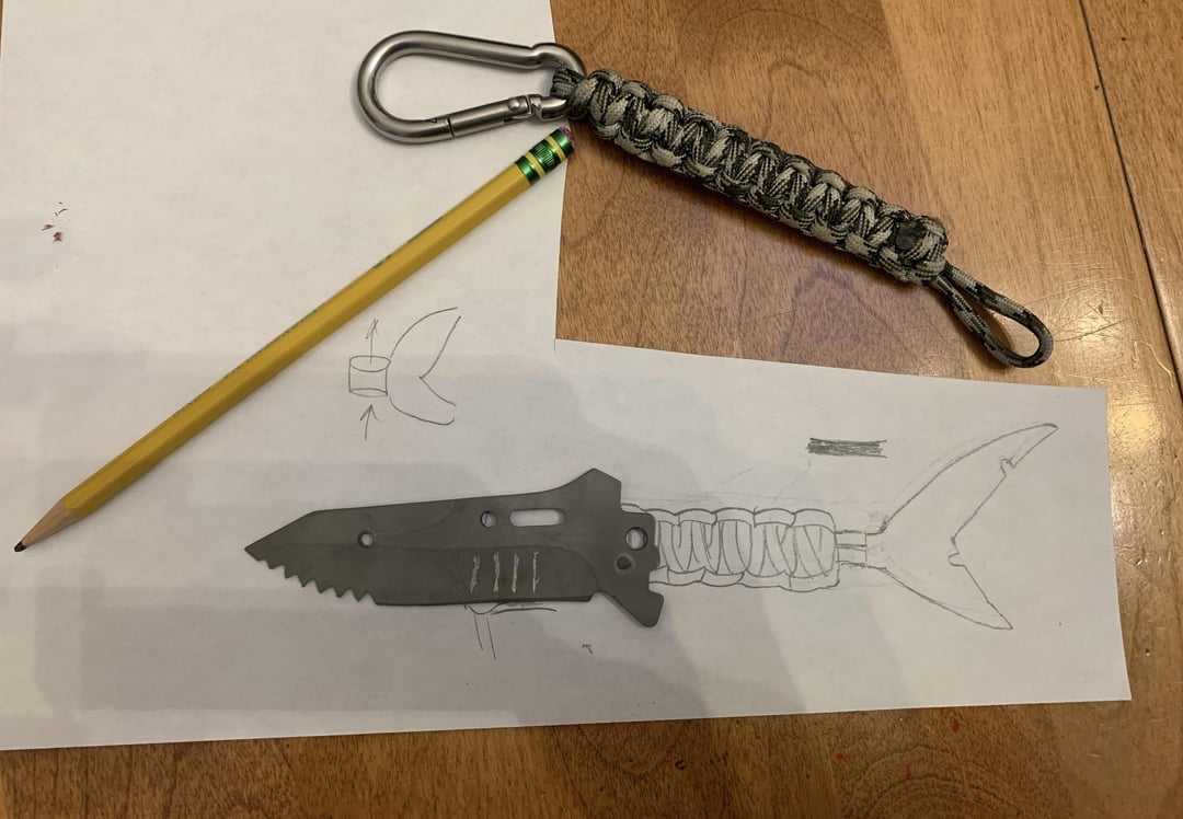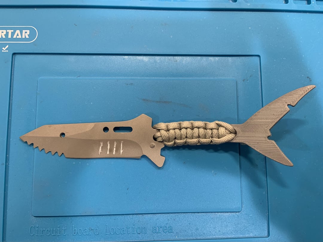 My mom designed the shark blade and cut the teeth with a dremel. I sandblasted the blade, scratched in the gills, and tied the paracord. My mom drew out the tail design, and my dad took her design and made it into a 3D print, tapered and everything.