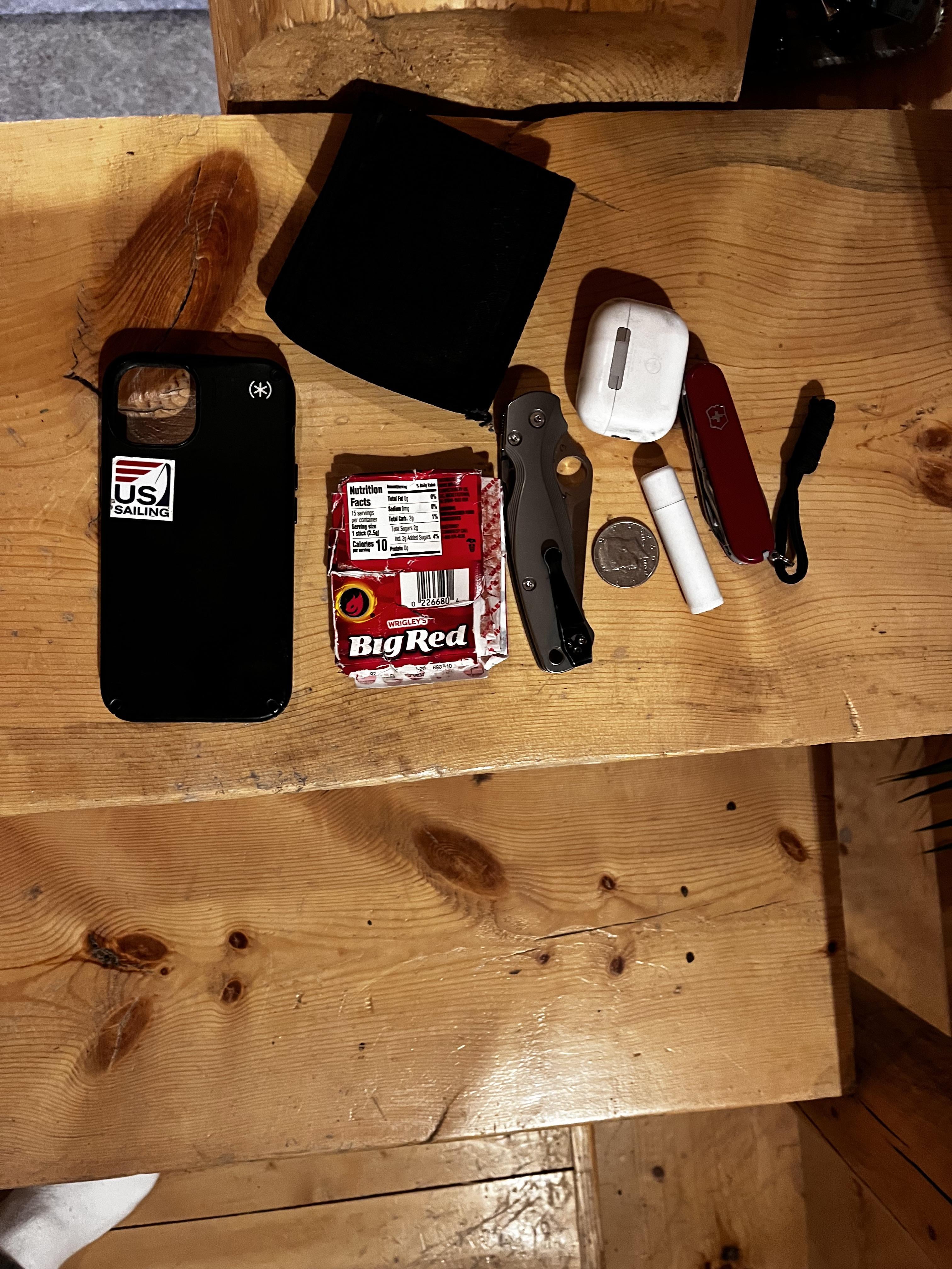 iPhone 13, AirPods Pro, Big red, Spyderco PM2 tanto with flytanium scales/backspacer, Victorinox Spartan, Chap stick, Maxpedition wallet, 1972 Half dollar